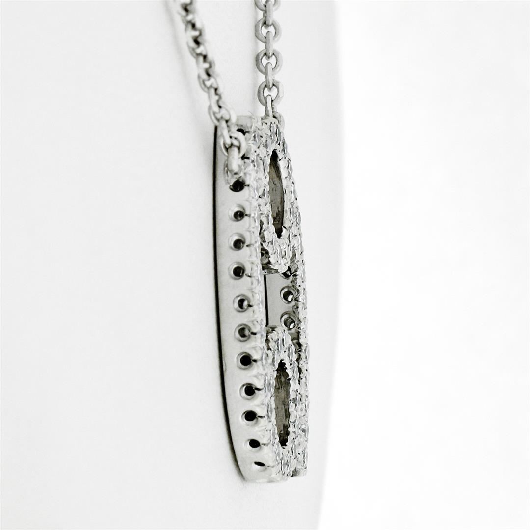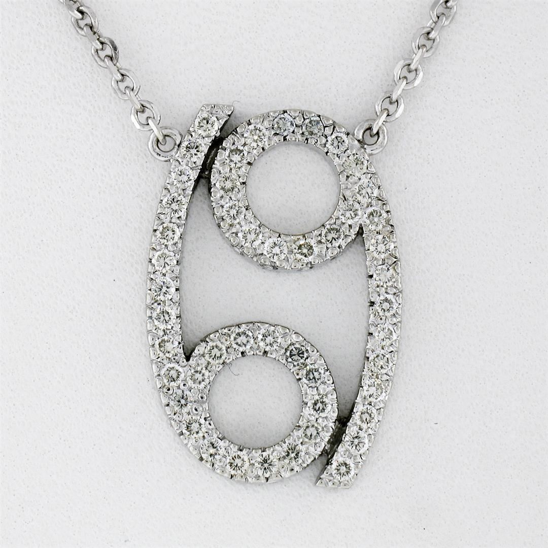 A new solid 14k white gold zodiac cancer pendant necklace, with 48 round brilliant cut natural diamonds (F/G - VS2 ; 0.48ctw). The pendant weighs a total of 6.52 grams, measures 21.52x14.58mm including the bail, and 16 inch faceted cable link chain.