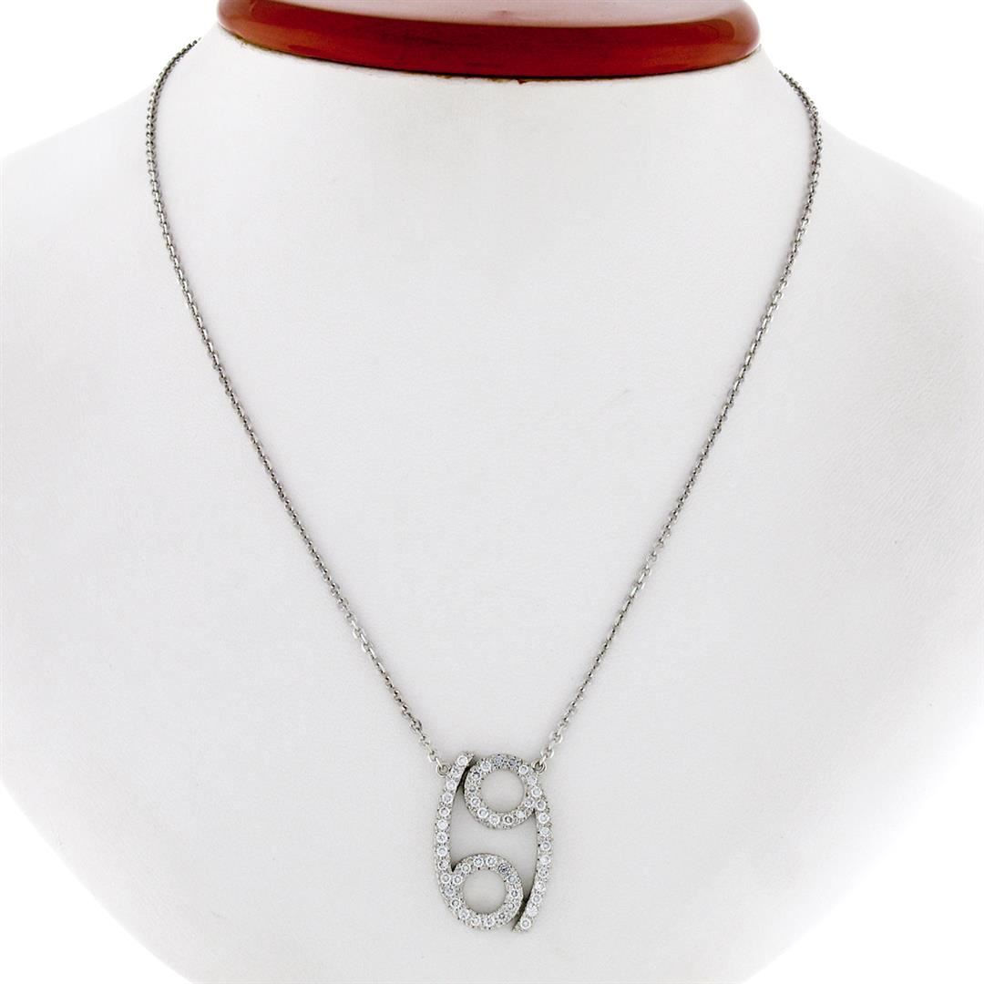A new solid 14k white gold zodiac cancer pendant necklace, with 48 round brilliant cut natural diamonds (F/G - VS2 ; 0.48ctw). The pendant weighs a total of 6.52 grams, measures 21.52x14.58mm including the bail, and 16 inch faceted cable link chain.