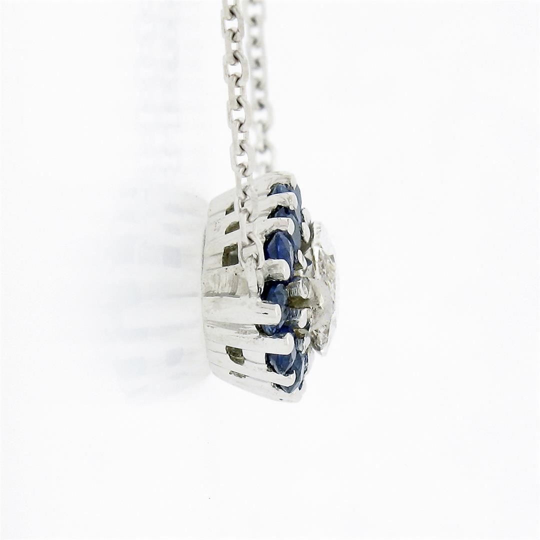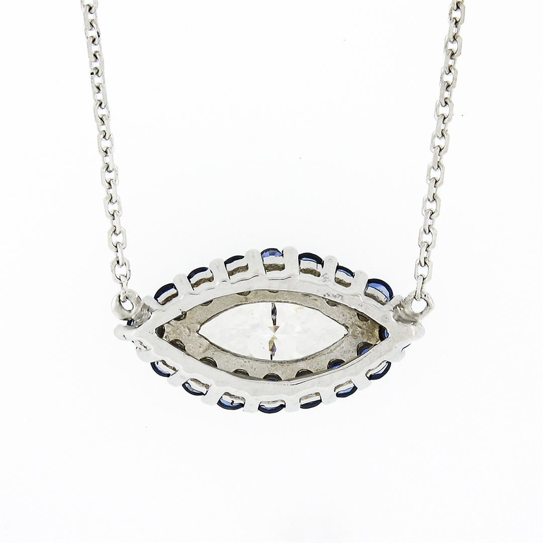 A news solid 18k white gold evil eye pendant necklace, with 1 gia certified marquise cut natural diamond (E - VS2 ; 0.88ct), and 16 round brilliant cut natural sapphires (0.68ctw). The pendant weighs a total of 3.81 grams, measures 8.85x16.40mm including the bail, and adjustable at 17 or 19 inch cable link chain. Comes with all original relevant certifications.