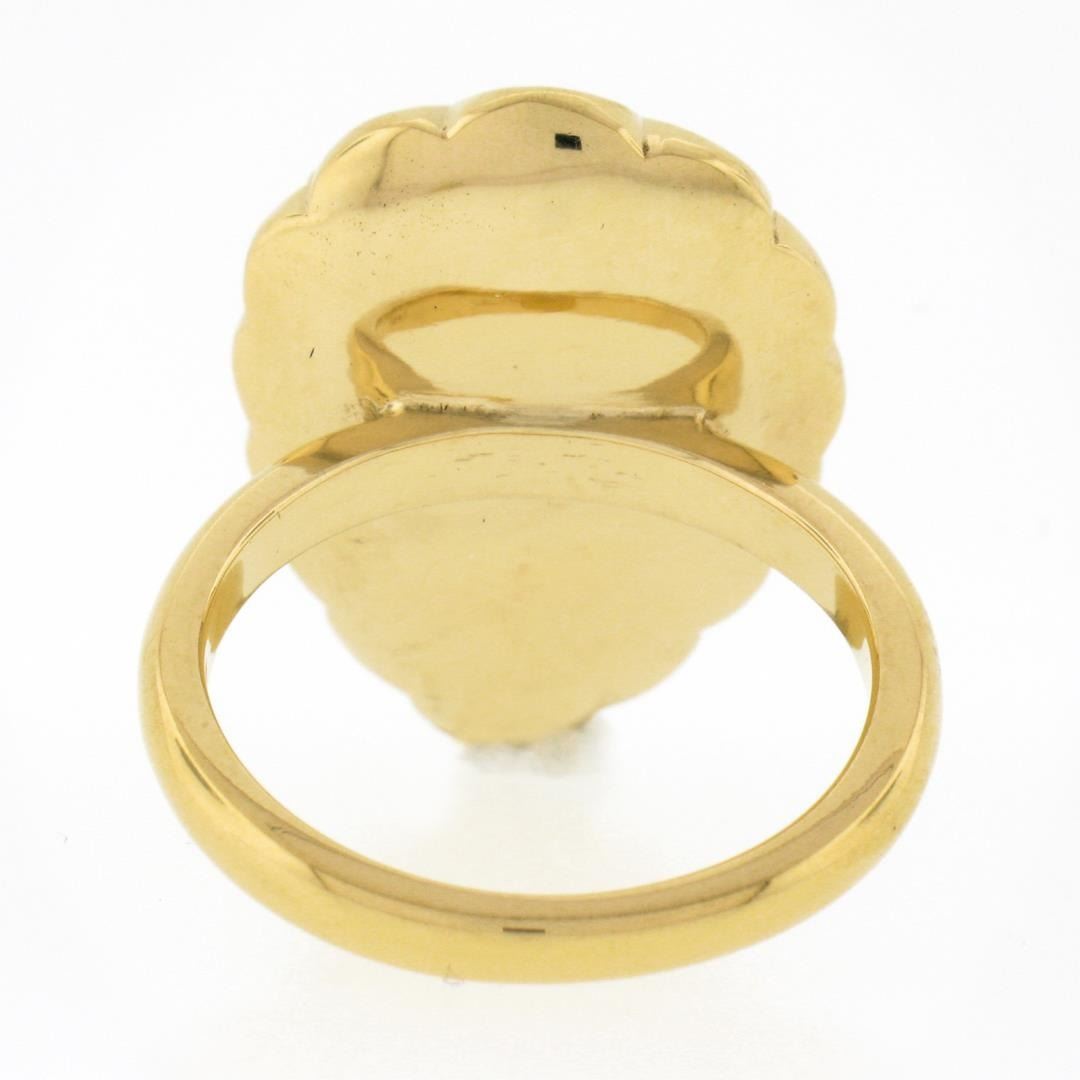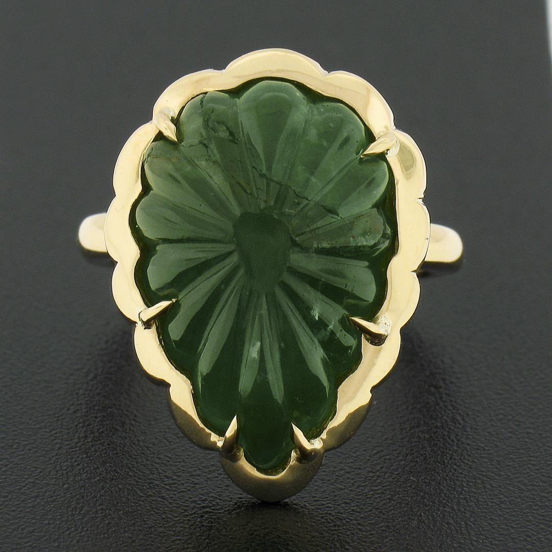 A new solid 18k yellow gold cocktail ring, featuring 1 GIA graded scalloped pear cabochon cut natural emerald ( 9.99ct ). The ring is size 7.0, weighs a total of 12.94 grams, and measures 23.60mm wide. Comes with all original relevant certifications.