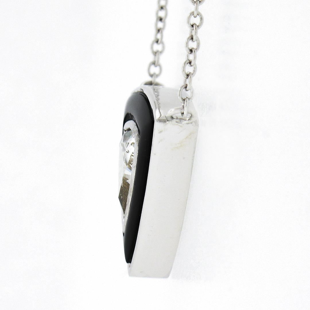 A news solid 18k white gold pendant necklace, with 1 GIA graded marquise cut natural diamond (G - SI1 ; 1.09ct ), and 1 custom cut natural black onyx. Adjustable 16.5 to 18.5 inch cable link chain, 6.76 grams total weight, pendant measures 15.25x15.80mm. Comes with all original relevant certifications.