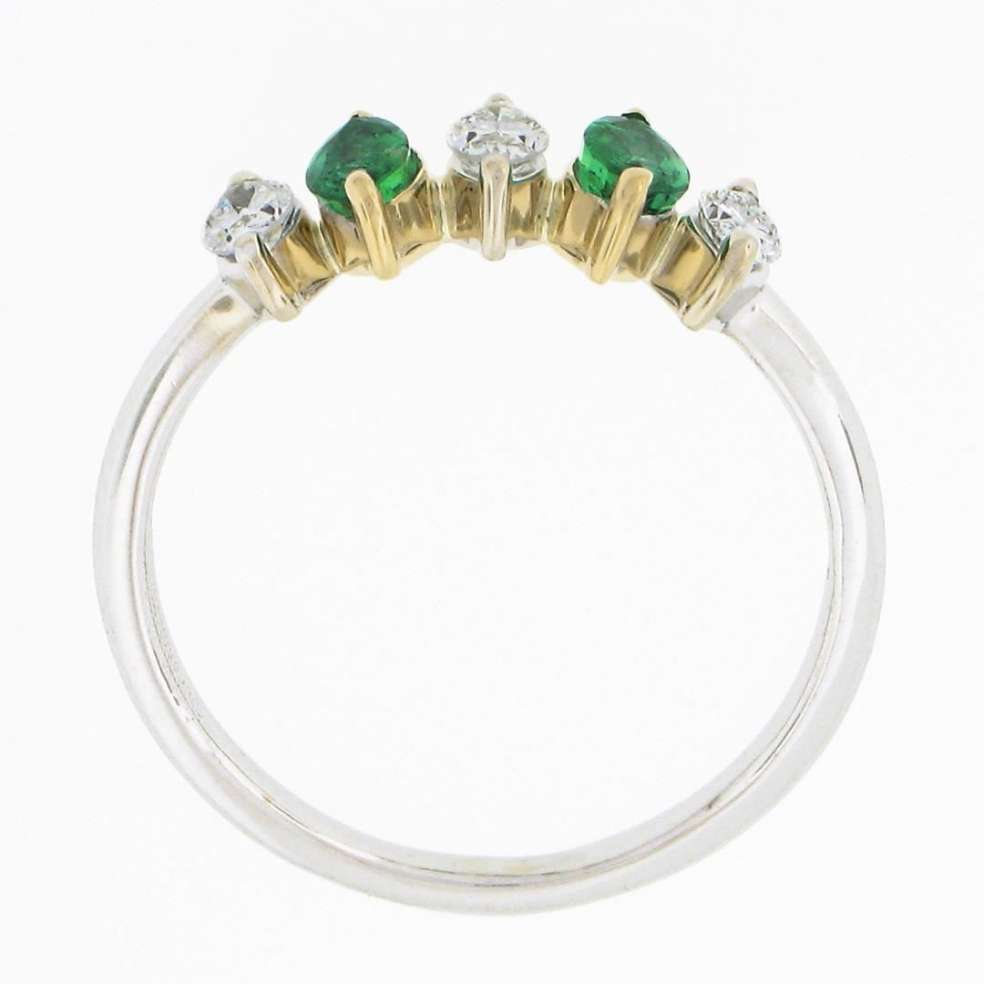 A new solid 18k two tone gold ring. with 2 marquise cut natural emeralds (0.33ctw), and 3 marquise cut natural diamonds (G/H - 0.33ctw ; 0.33ctw). The ring is size 6.5, weighs a total of 2.54 grams, and measures 6.30mm wide.