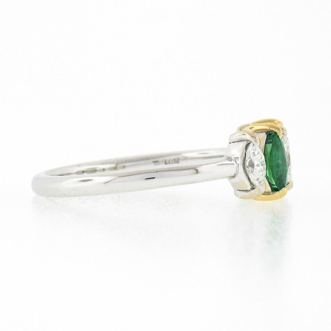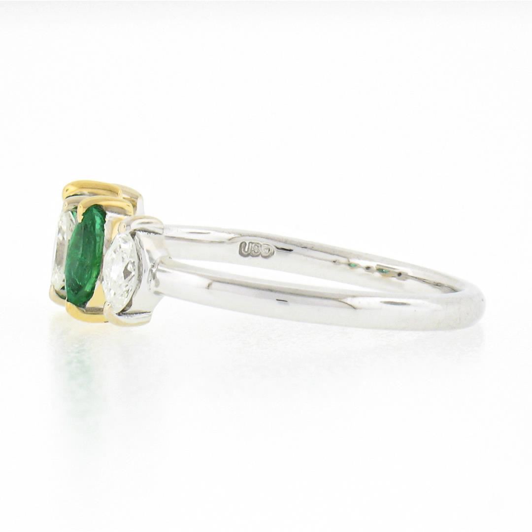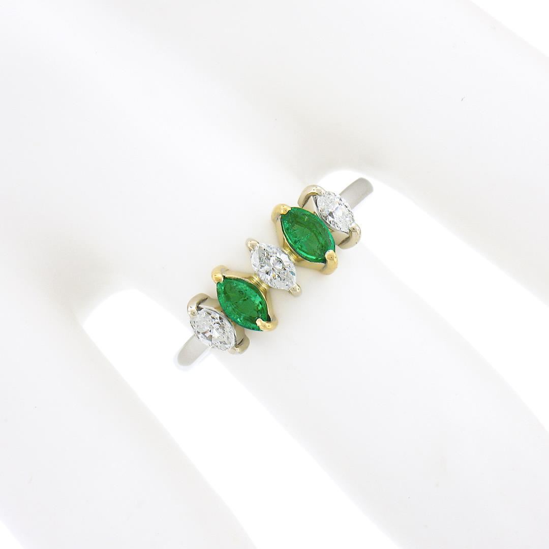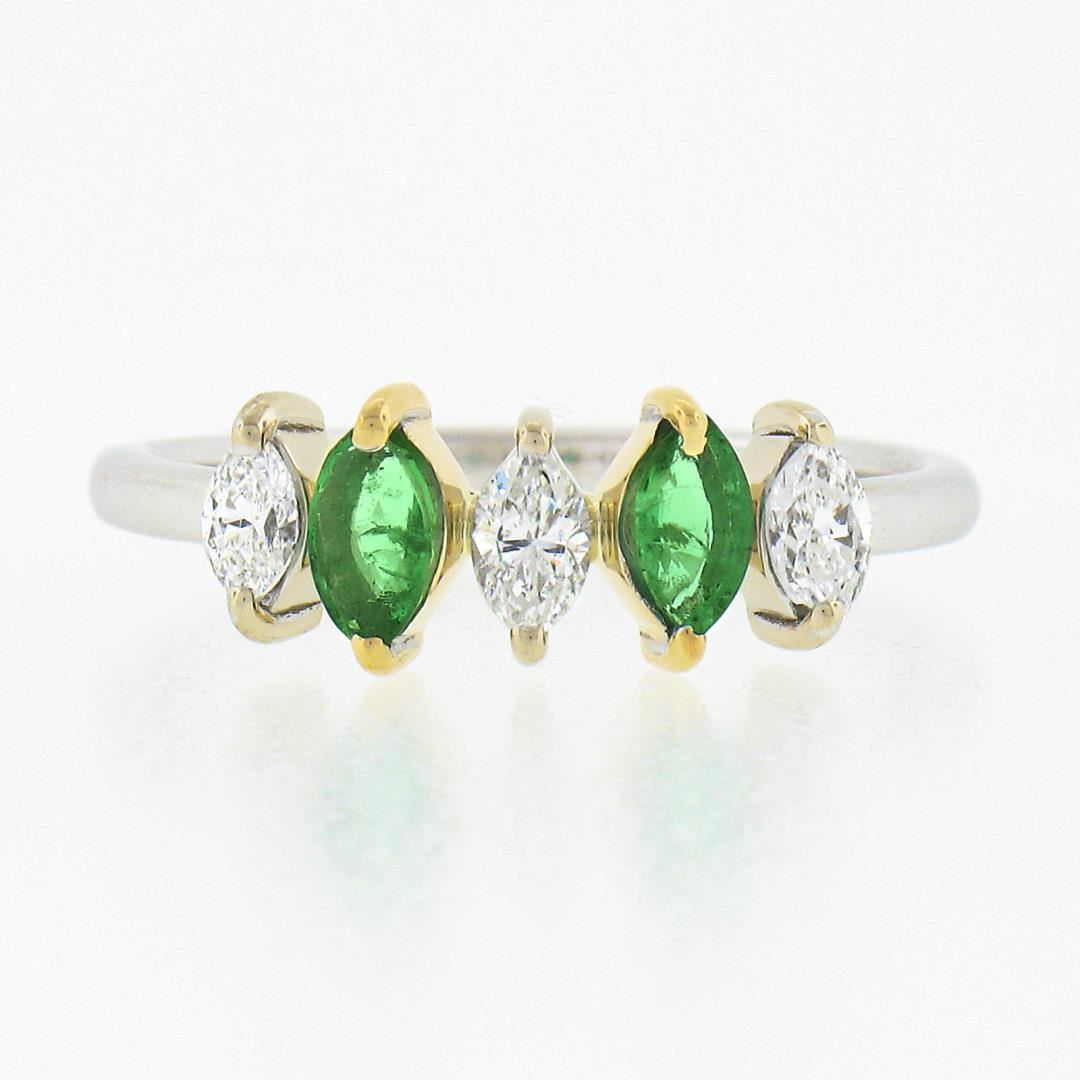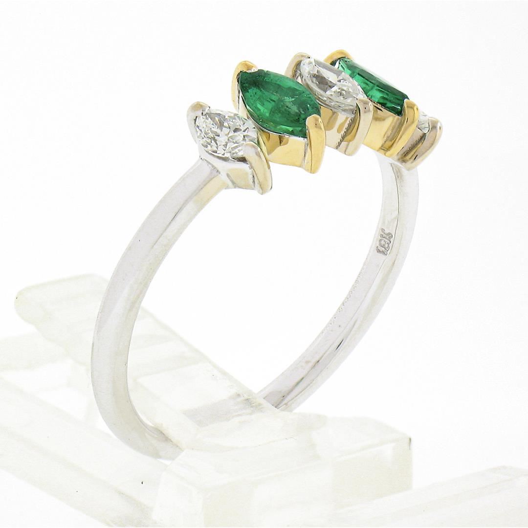 A new solid 18k two tone gold ring. with 2 marquise cut natural emeralds (0.33ctw), and 3 marquise cut natural diamonds (G/H - 0.33ctw ; 0.33ctw). The ring is size 6.5, weighs a total of 2.54 grams, and measures 6.30mm wide.