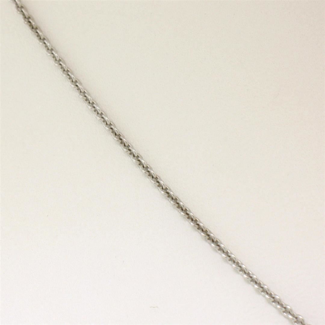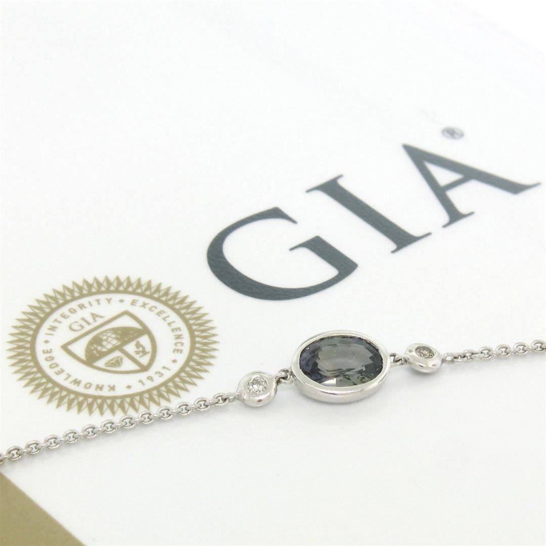 A new solid 18k white gold pendant necklace, with 1 Gia certified oval cut natural sapphire (7.70 x 5.67 x 3.36mm), with 2 round brilliant cut natural diamonds (G- VS1; 0.06ctw). 16 inch fine cable link chain, 4.05 grams total weight, pendant measures 7.40x20.48mm. Comes with all original relevant certifications.