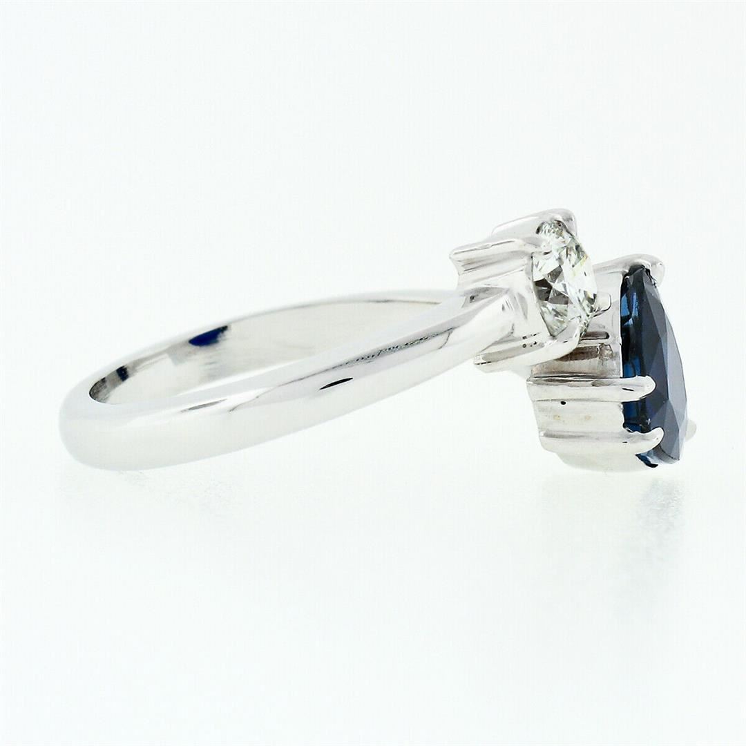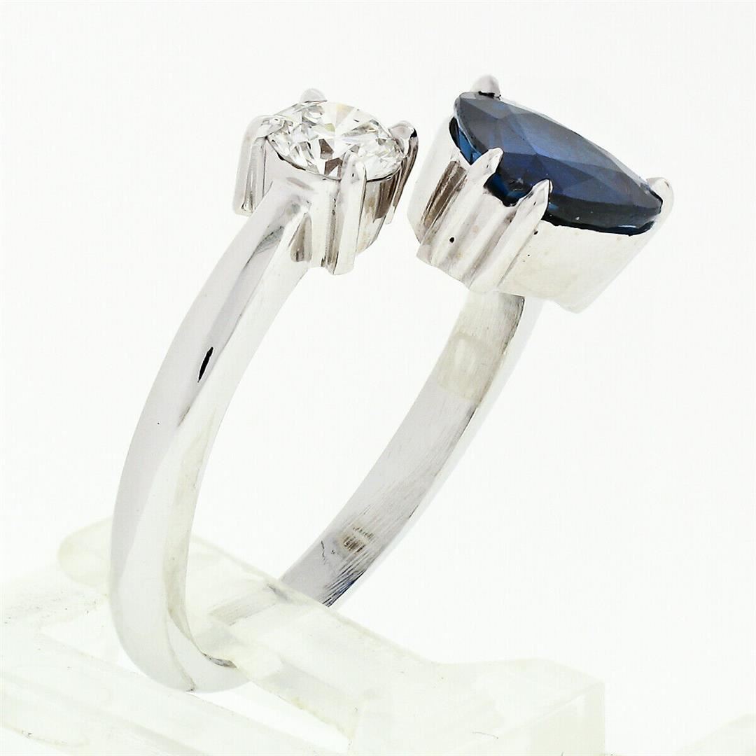 A new solid 18k white gold moi et toi bypass ring, with 1 GIA certified heart brilliant cut natural sapphire (6.88 x 8.14mm), and 1 round brilliant cut natural diamond (H - VS2; 0.42ct). The ring is size 6.5, weighs a total of 4.22 grams, and measures 11.6mm wide. Comes with all original relevant certifications.
