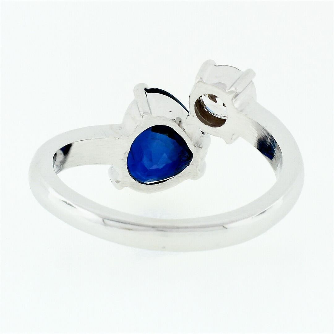 A new solid 18k white gold moi et toi bypass ring, with 1 GIA certified heart brilliant cut natural sapphire (6.88 x 8.14mm), and 1 round brilliant cut natural diamond (H - VS2; 0.42ct). The ring is size 6.5, weighs a total of 4.22 grams, and measures 11.6mm wide. Comes with all original relevant certifications.