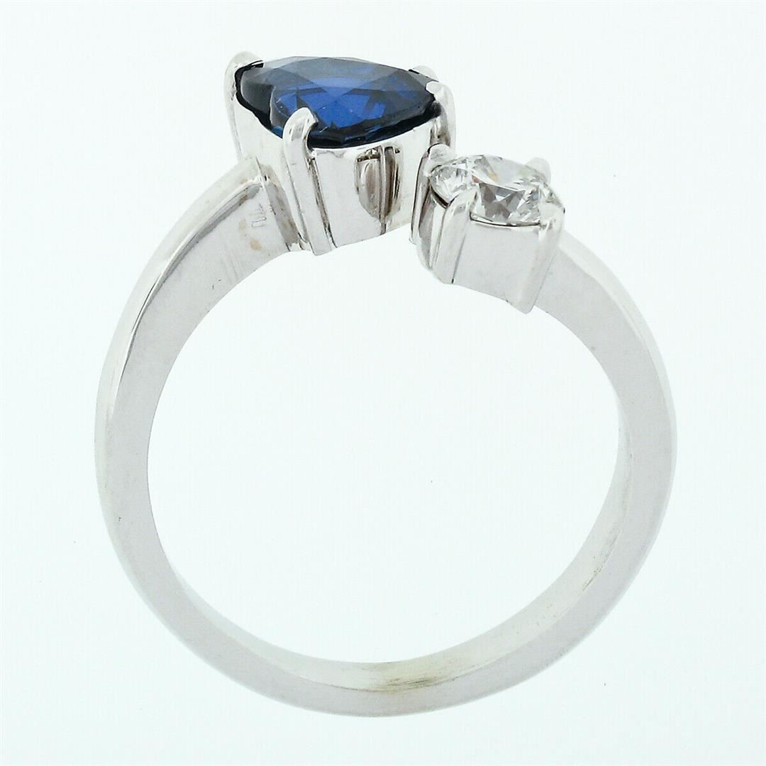 A new solid 18k white gold moi et toi bypass ring, with 1 GIA certified heart brilliant cut natural sapphire (6.88 x 8.14mm), and 1 round brilliant cut natural diamond (H - VS2; 0.42ct). The ring is size 6.5, weighs a total of 4.22 grams, and measures 11.6mm wide. Comes with all original relevant certifications.