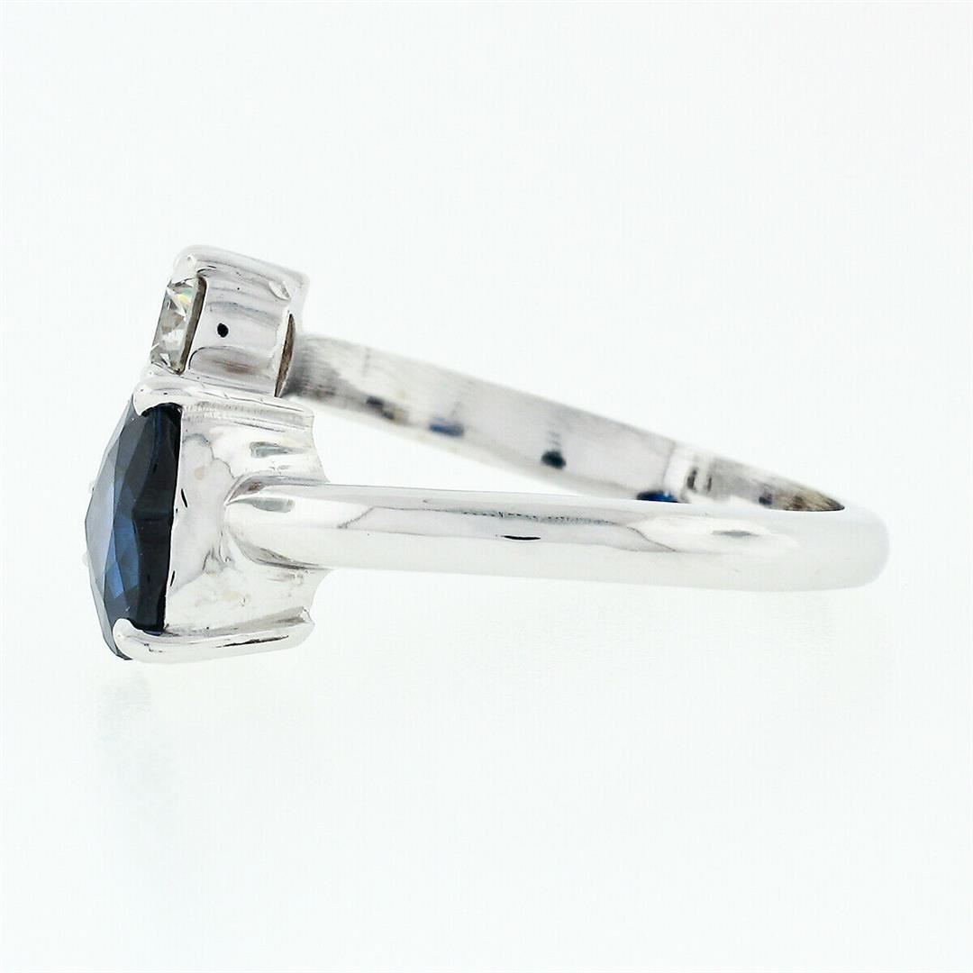 A new solid 18k white gold moi et toi bypass ring, with 1 GIA certified heart brilliant cut natural sapphire (6.88 x 8.14mm), and 1 round brilliant cut natural diamond (H - VS2; 0.42ct). The ring is size 6.5, weighs a total of 4.22 grams, and measures 11.6mm wide. Comes with all original relevant certifications.