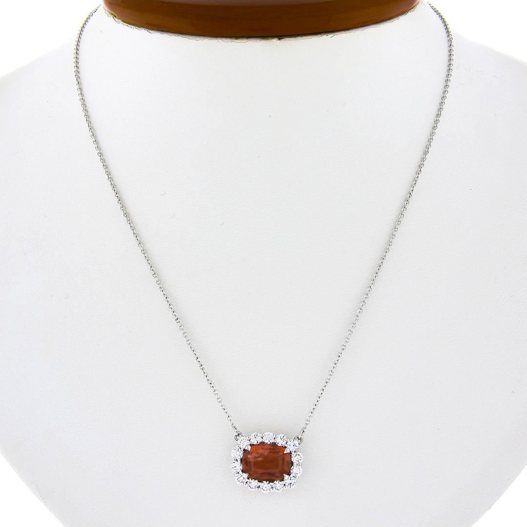 A new solid 18k white gold pendant necklace, featuring 1 GIA graded cushion cut natural spinel (2.69ct), surrounded with a halo of 14 round brilliant cut natural diamonds (G/H - VS1/VS2 ; 0.92ctw ). Adjustable at 16.5 or 18.5 inch cable link chain, 5.20 grams total weight, pendant measures 12.85x15.40mm. Comes with all original relevant certifications.