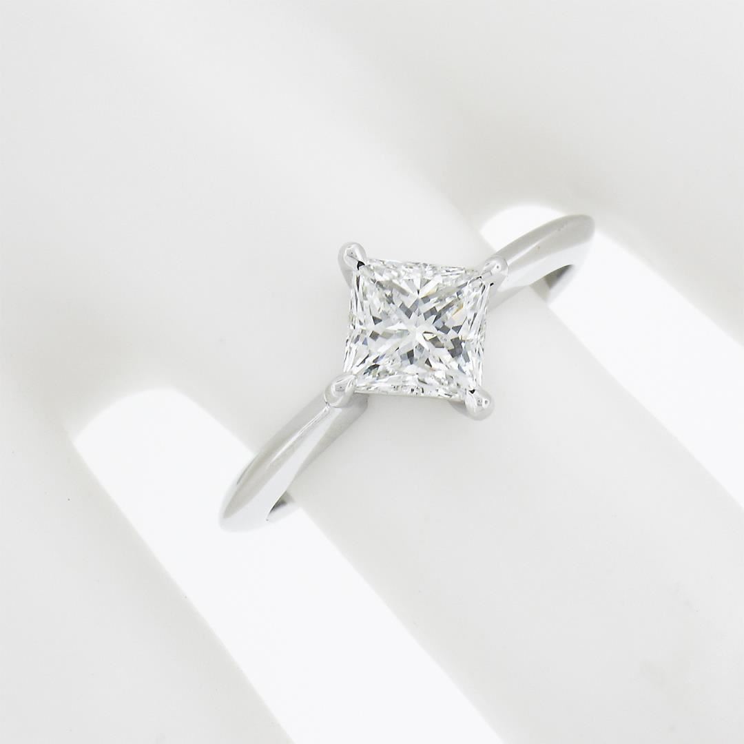 A new solid 18k white gold soliatire engagement ring, featuring 1 GIA graded princess cut natural diamond (I - SI1 ; 1.10ct). The ring is size 6.5, weighs a total of 3.12 grams, and measures 9.3mm wide. Comes with all original relevant certifications.