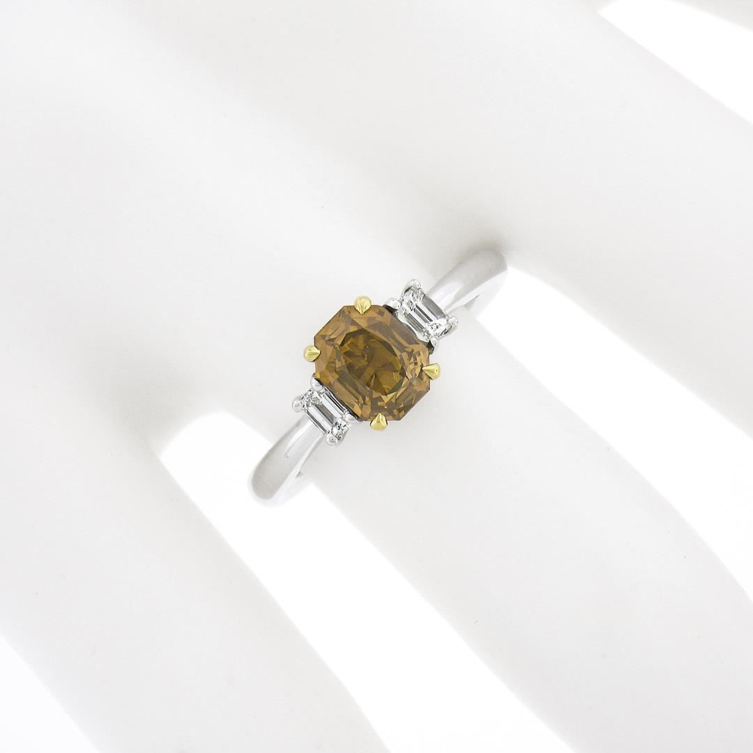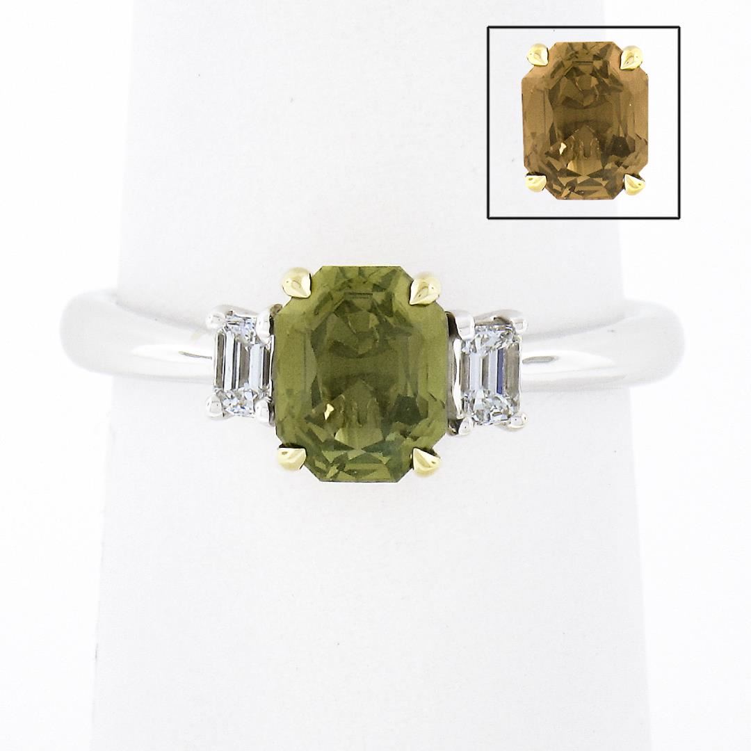 A new solid 18k white gold engagement ring, with 1 GIA graded octagonal cut natural alexandrite (1.24ct), and 2 emerald cut natural diamonds (G/H - VS1/VS2 ; 0.22ct). The ring is size 6.5, weighs a total of 3.45 grams, and measures 6.80mm wide. Comes with all original relevant certifications.