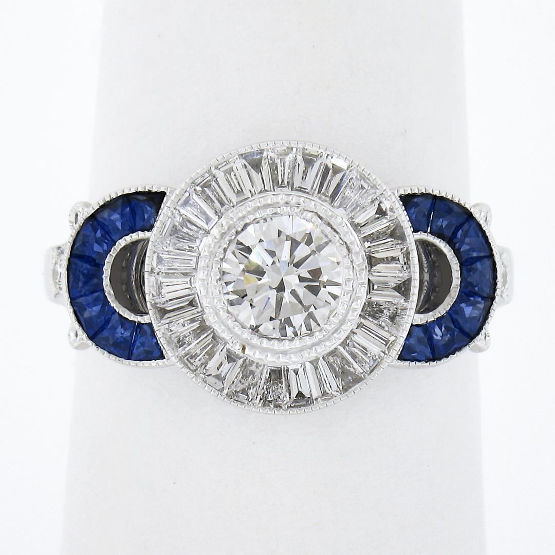 A new solid 18k white gold ring, with 1 GIA graded round brilliant cut natural diamond (H - VS2 ; 0.60ct), and a halo of 29 baguette & round brilliant cut natrual diamonds (G/H - VS1/VS2 ; 0.58ctw), with 14 calibre french cut natural sapphires (0.48ctw). The ring is size 6.5, weighs a total of 4.45 grams, and measures 11.30mm wide. Comes with all original relevant certifications.