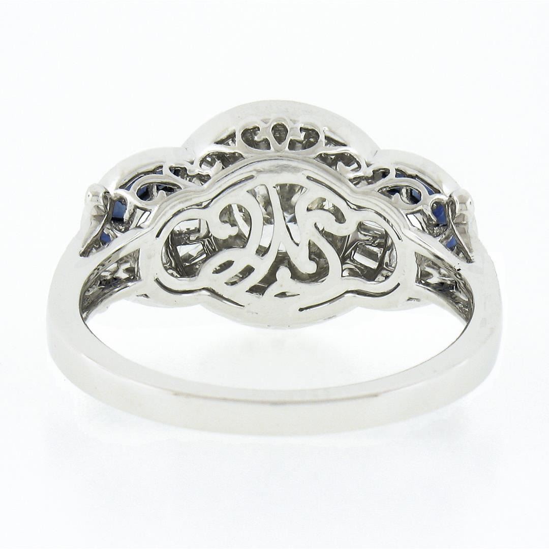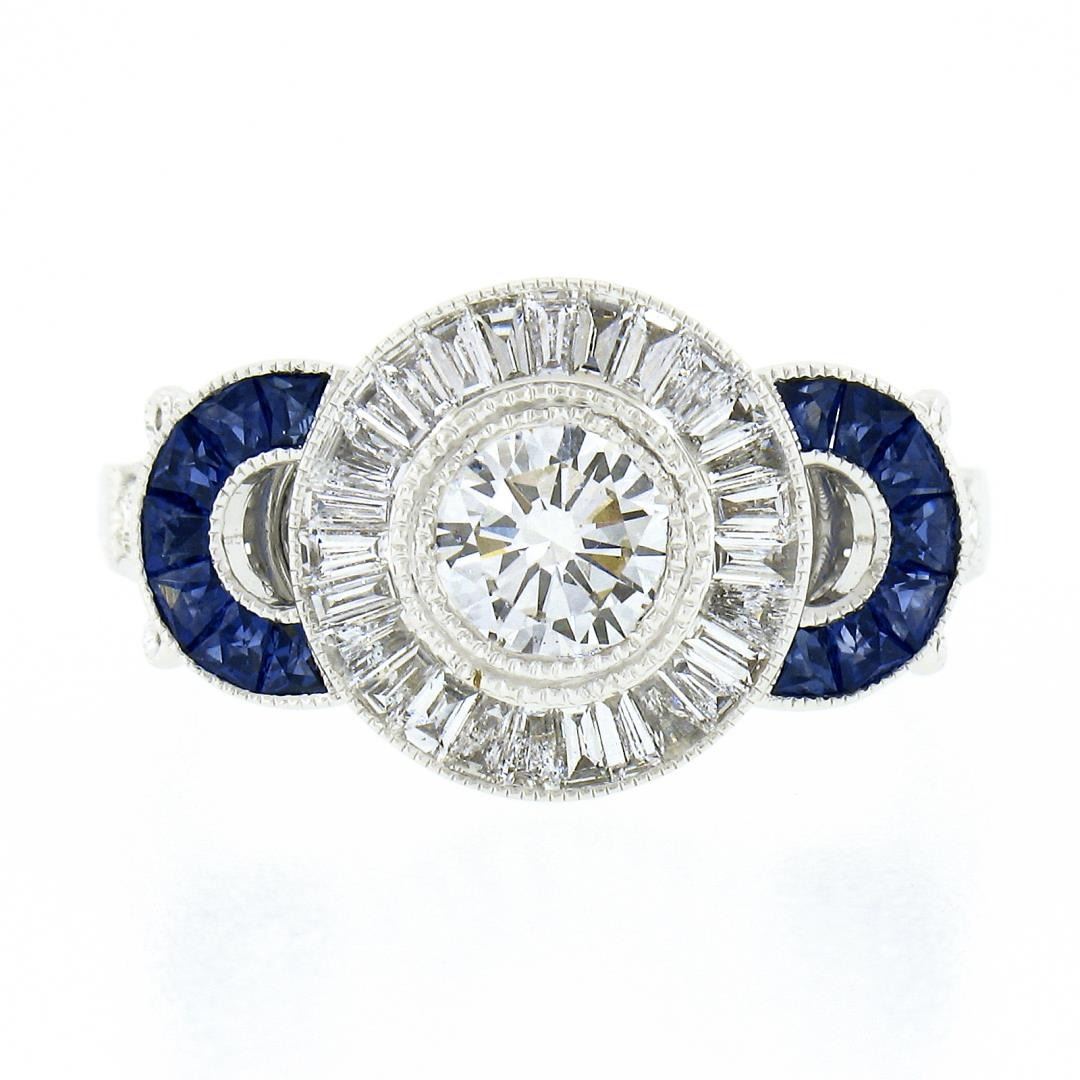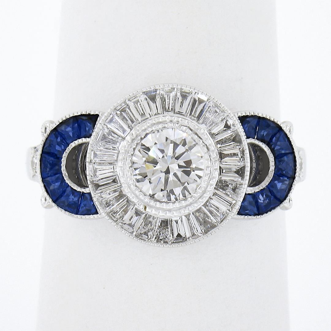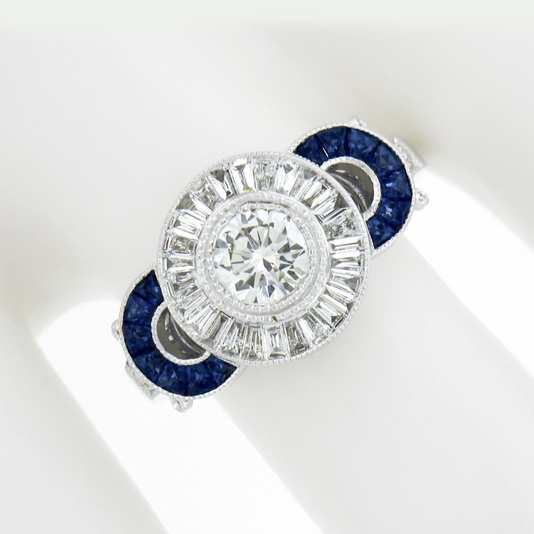 A new solid 18k white gold ring, with 1 GIA graded round brilliant cut natural diamond (H - VS2 ; 0.60ct), and a halo of 29 baguette & round brilliant cut natrual diamonds (G/H - VS1/VS2 ; 0.58ctw), with 14 calibre french cut natural sapphires (0.48ctw). The ring is size 6.5, weighs a total of 4.45 grams, and measures 11.30mm wide. Comes with all original relevant certifications.