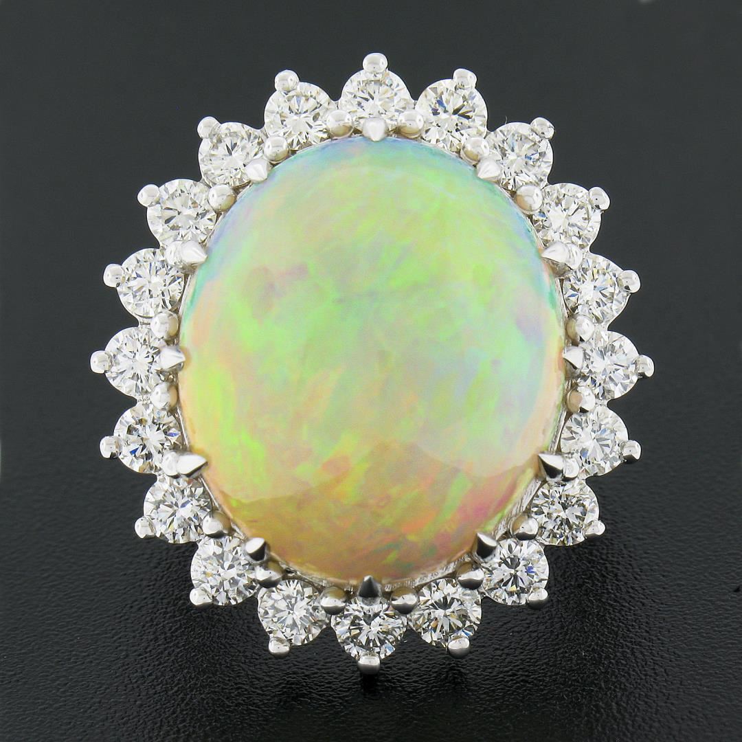 A new solid 18k white gold ring, with 1 GIA graded oval cabohcon cut natural opal (19.54x16.89x9.0mm / 15.47ct ), surrounded with a halo of 20 round brilliant cut natural diamonds (G/H - VS1/VS2 ; 2.14ctw). The ring is size 6.5, weighs a total of 13.58 grams, and measures 27.30mm wide. Comes with all original relevant certifications.