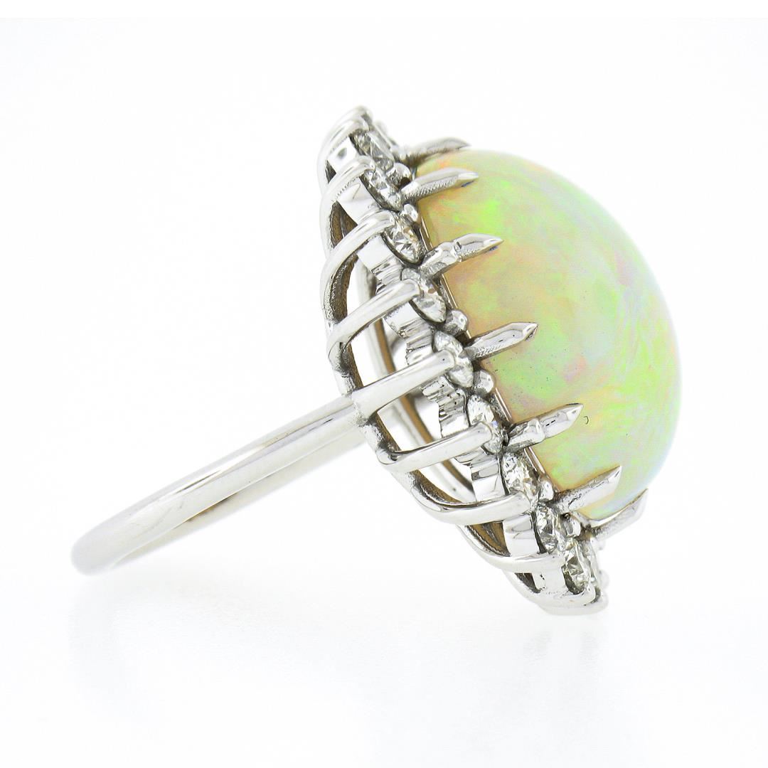 A new solid 18k white gold ring, with 1 GIA graded oval cabohcon cut natural opal (19.54x16.89x9.0mm / 15.47ct ), surrounded with a halo of 20 round brilliant cut natural diamonds (G/H - VS1/VS2 ; 2.14ctw). The ring is size 6.5, weighs a total of 13.58 grams, and measures 27.30mm wide. Comes with all original relevant certifications.