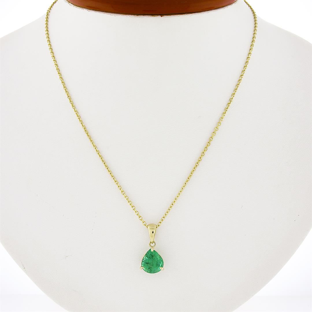 A new solid 18k yellow gold pendant necklace, with 1 gia certified pead cut natural emerald (2.14ct). 18 inch cable link chain, 4.10 grams total weight, pendant measures 18.90x9.25mm. Comes with all original relevant certifications.