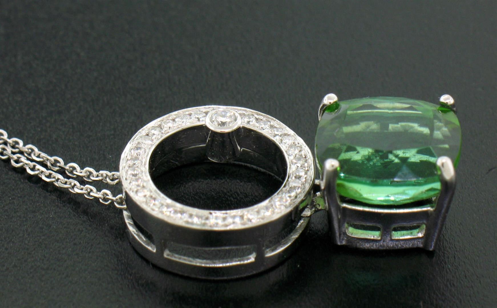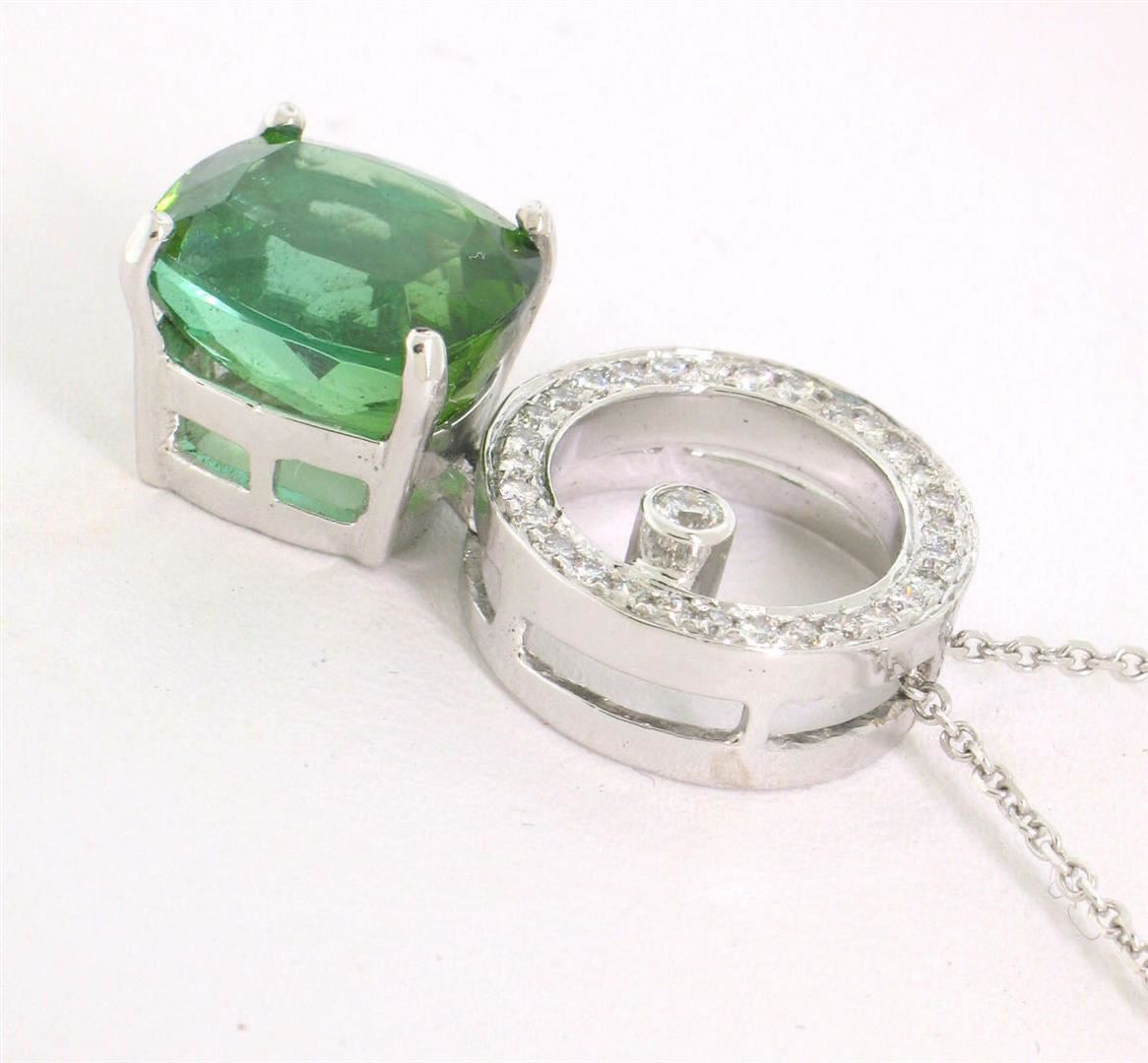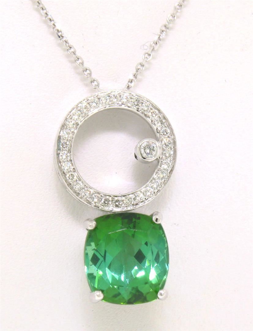 A new solid 18k white gold pendant necklace, featuring 1 cushion brilliant cut natural tourmaline (10.1x10.9mm - 3.50ct), and 27 round brilliant cut natural diamonds (F- VS2 ; 0.35ctw). The pendant weighs a total of 7.10 grams, measures 26.1x14.7mm including the bail, and 18 inch cable link chain.