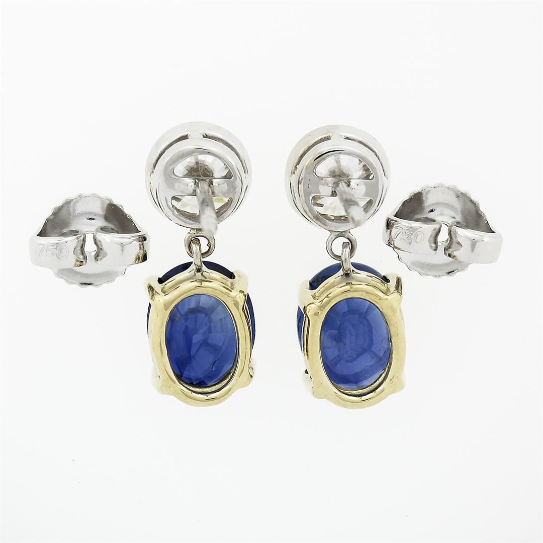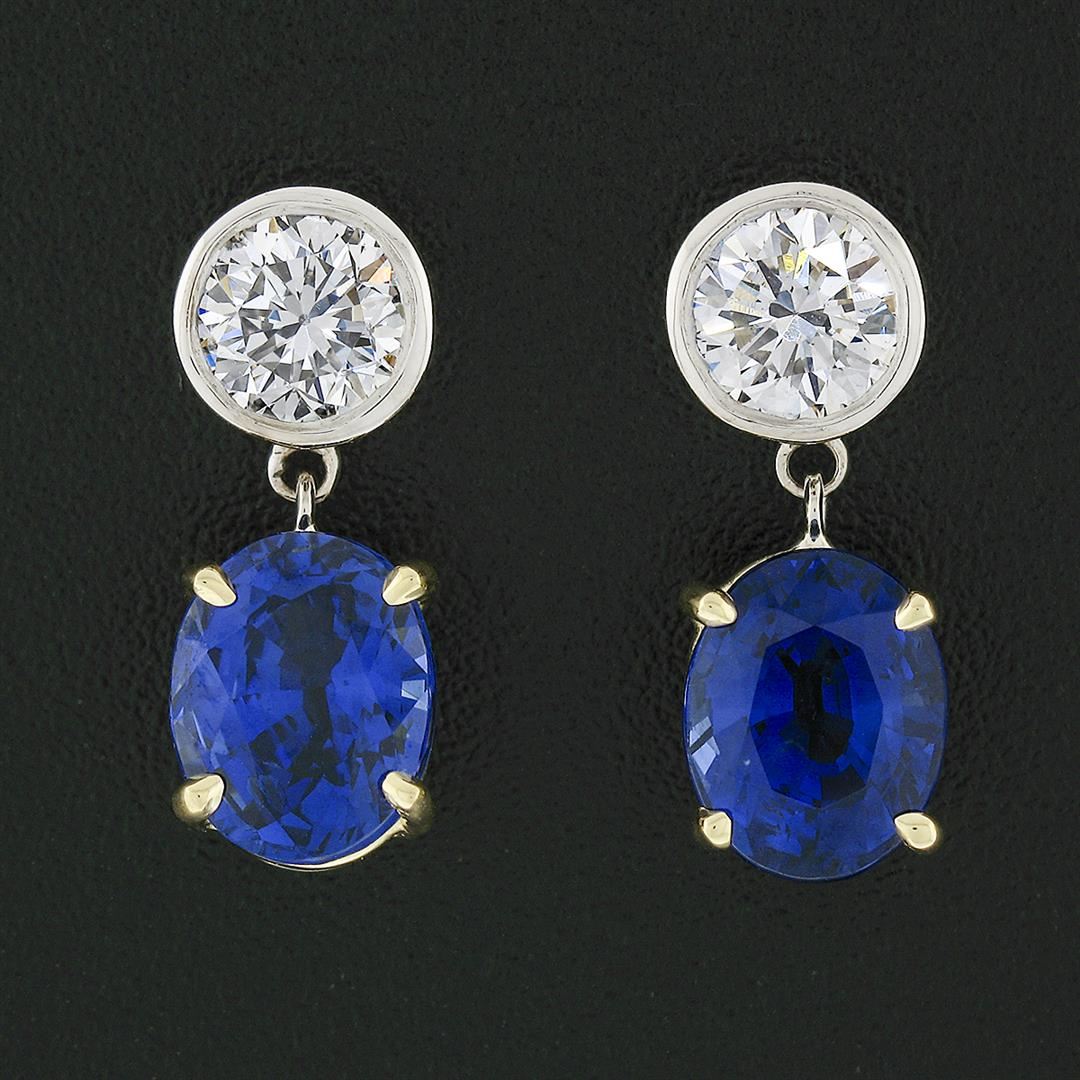 A new solod 18k yellow & white gold pair of drop dangle earrings, with 2 Gia ceritifed oval brilliant cut natural sapphires (3.80ctw), & 2 Gia certified round brilliant cut natural diamonds (H- SI1/SI2; 1.18ctw). The earrings measure approximately 16.7x6.1mm and weigh a total of 3.58 grams. Comes with all original relevant certifications.