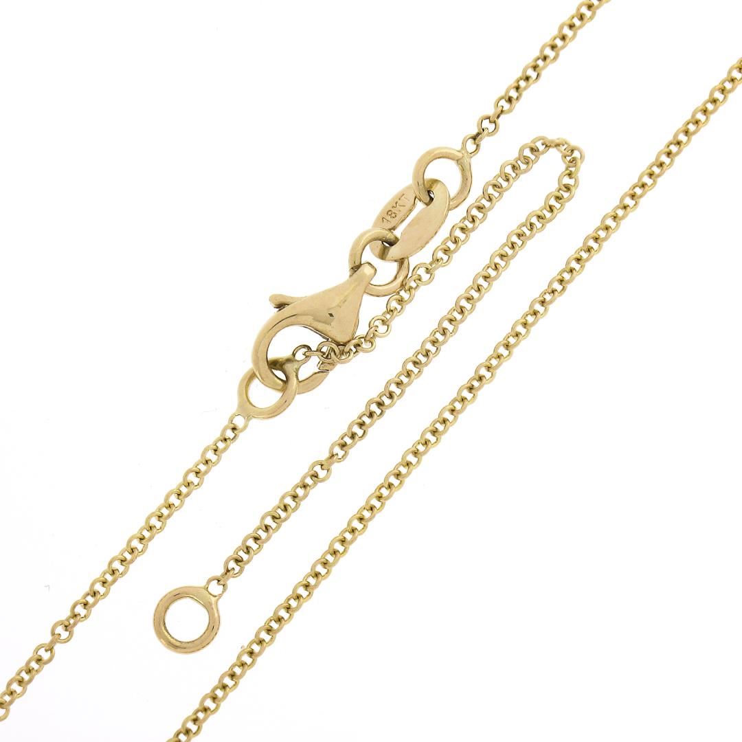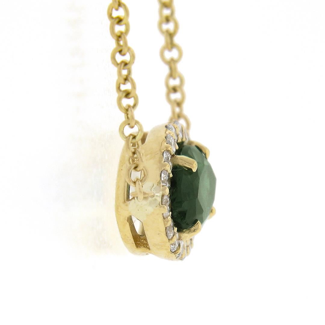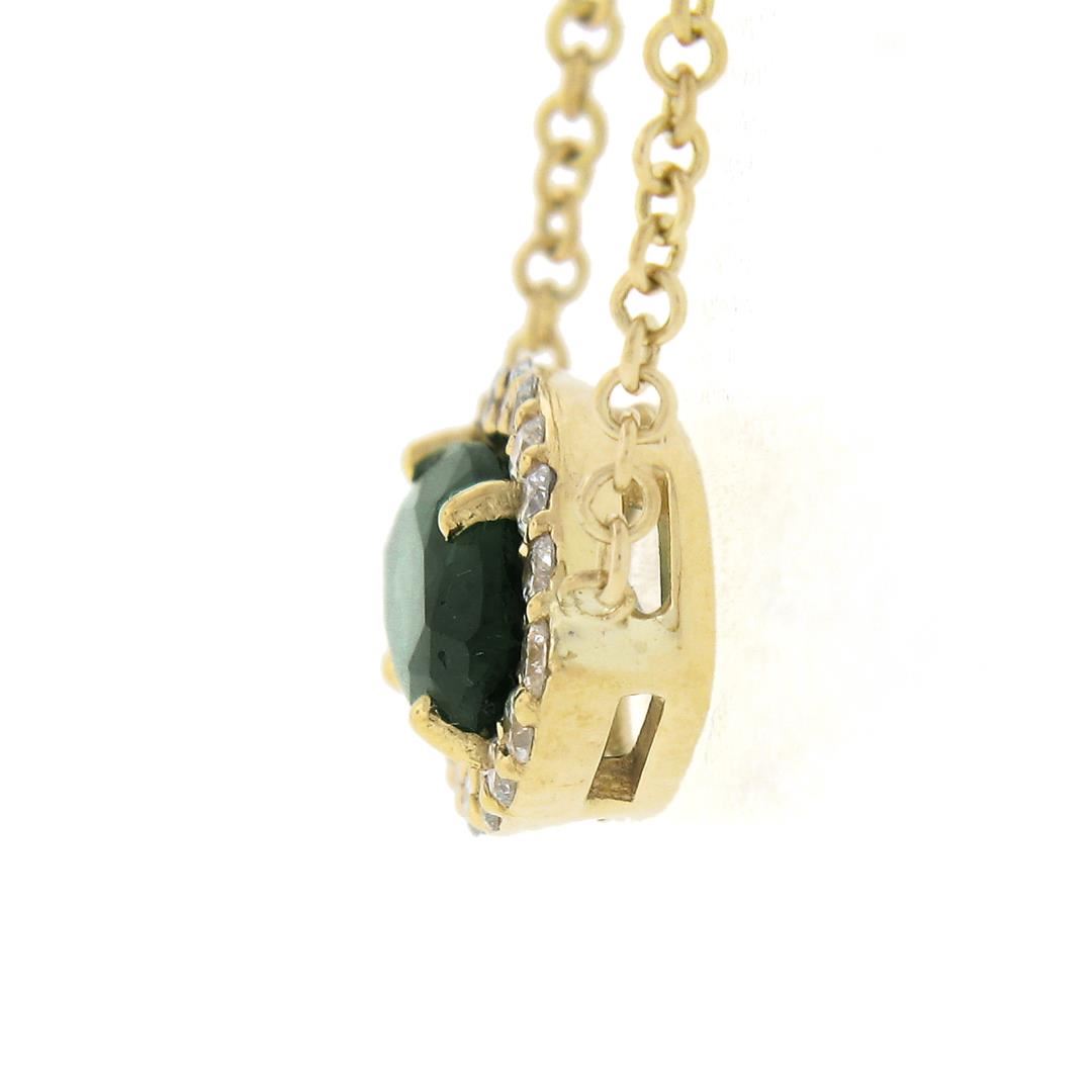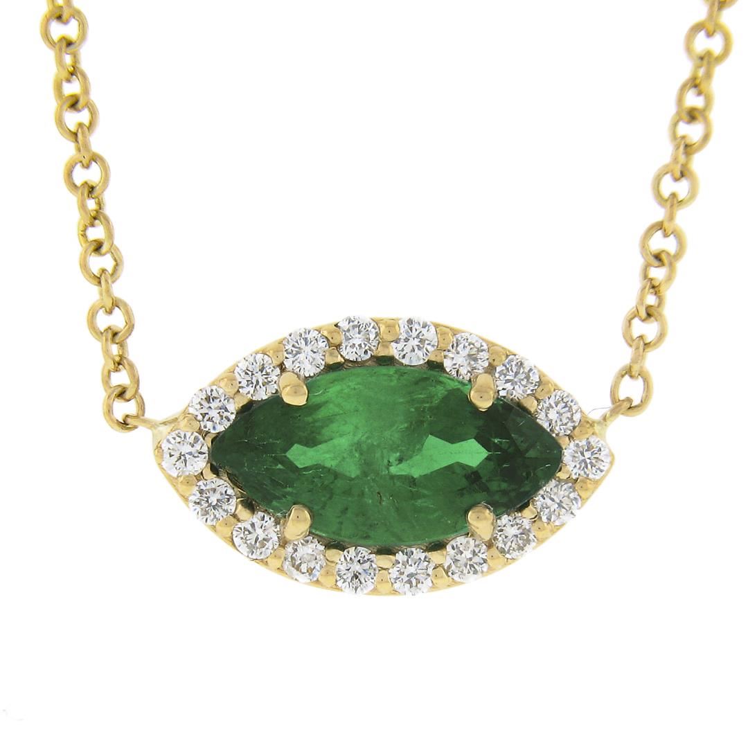 A new solid 18k yellow gold pendant necklace, with 1 GIA graded marquise cut natural emerald (0.67ct ), surrounded with a halo of round cut natural diamonds (G/H - VS2/SI1 ; 0.11ctw). Adjustable 16 or 18 inch cable link chain, 2.68 grams total weight, pendant measures 6.6x10.9mm. Comes with all original relevant certifications.