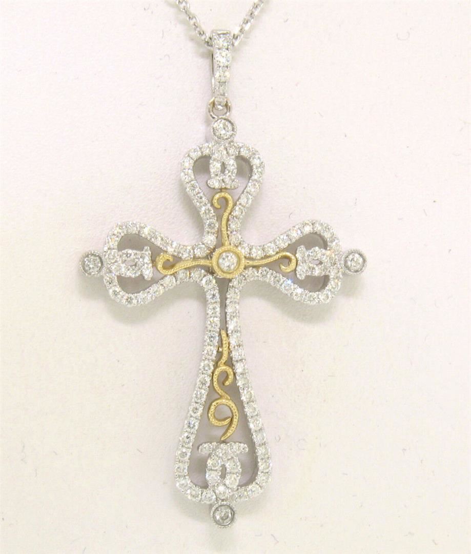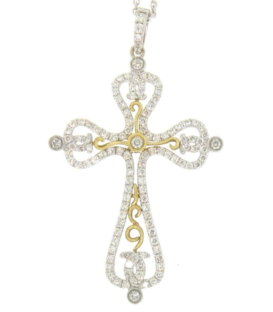 A new solid 18k white and yellow gold cross pendant, featuring ideal round cut natural diamonds (F - VS1/VS2; 1.26ctw). The pendant weighs a total of 7.2 grams, measures 44x#26mm including the bail.