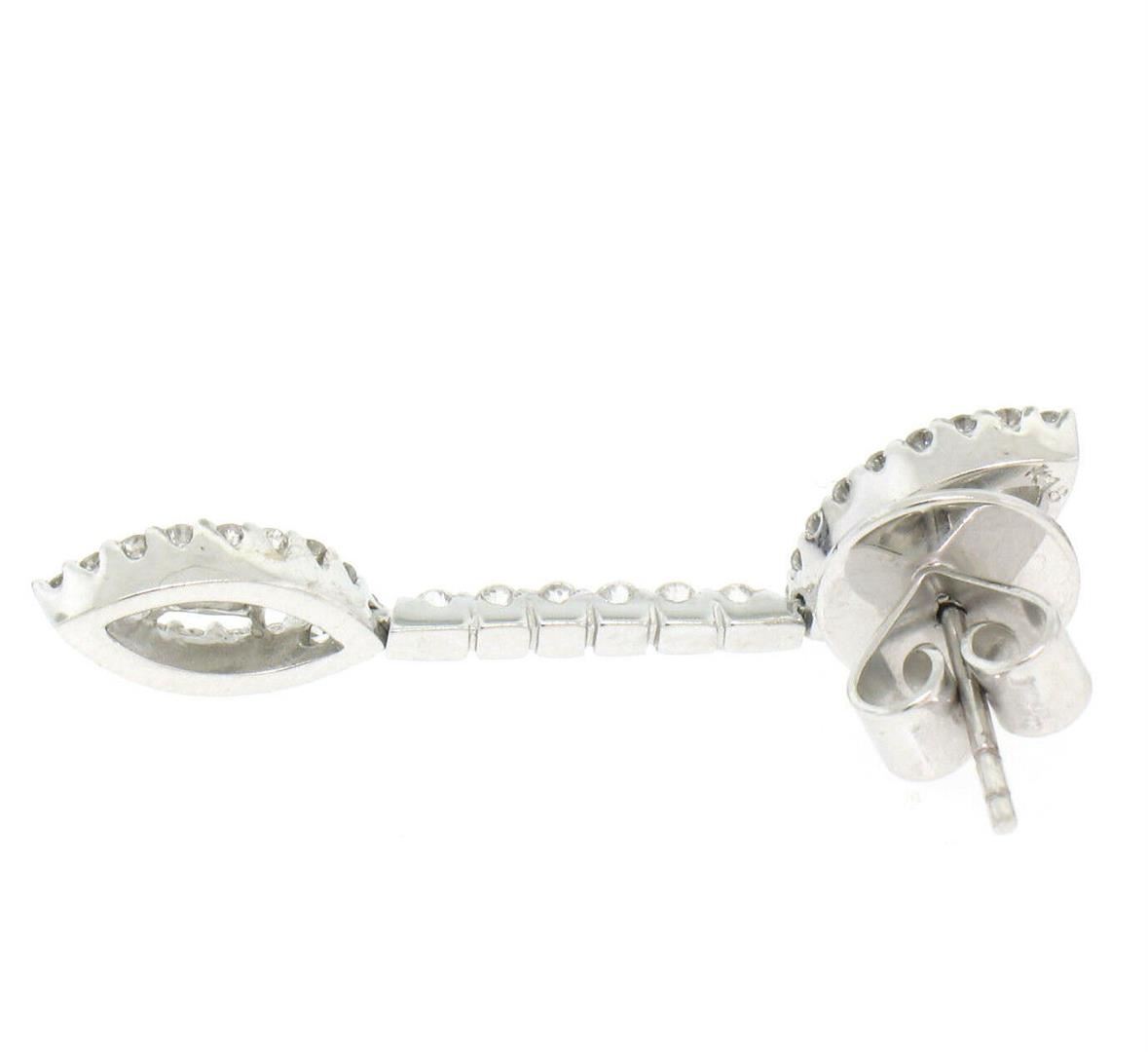 A new solid 18k white gold dangle drop earrings, with 4 baguette cut natural diamonds (F/G- VS1/VS2), and 76 round brilliant cut natural diamonds ( F/G- VS1/VS2 ) (0.95in total). The earrings measure approximately 33.65x5.67mm and weigh a total of 5.9 grams.