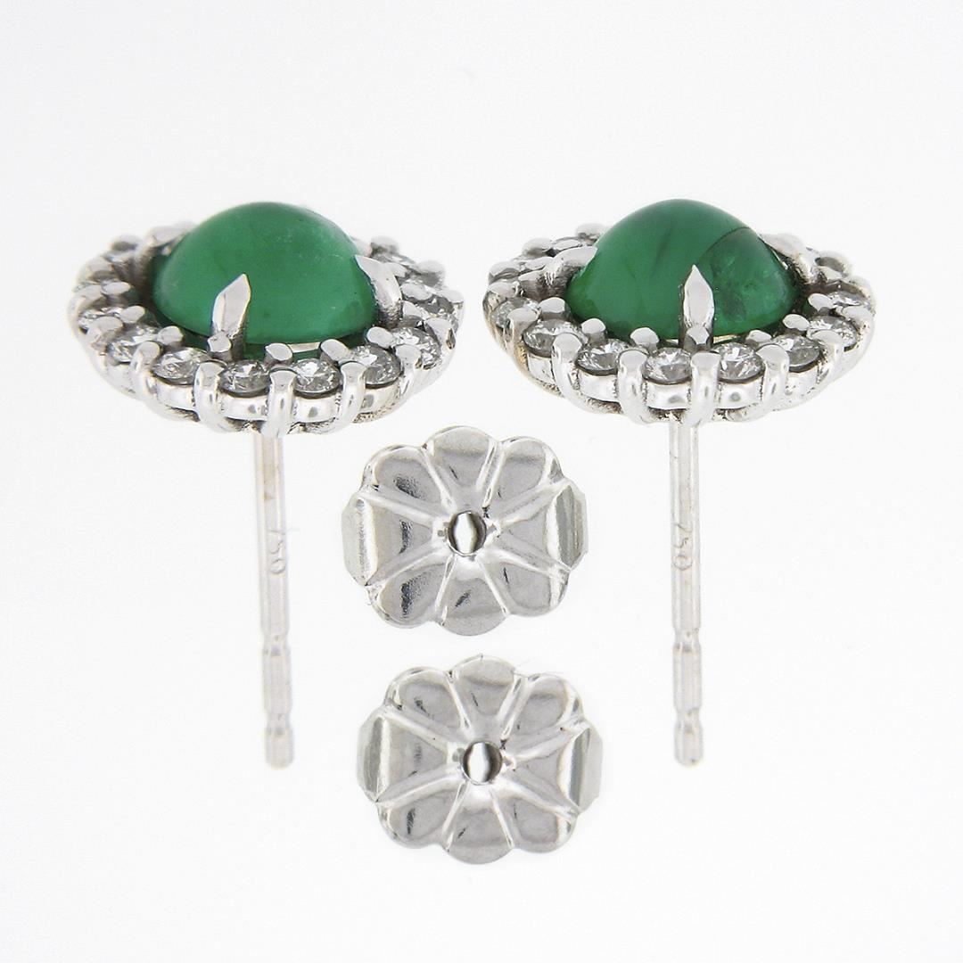 A new solid 18k white gold pair of stud earrings, with 2 round cabochon cut natural emeralds (1.30ctw), and a halo of 32 round brilliant cut natural diamonds (E/F - VS1/VS2 ; 0.42ctw). The earrings measure approximately 10.20mm in diameter and weigh a total of 3.0 grams.