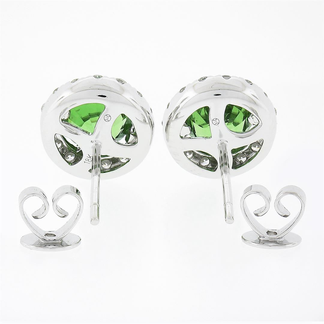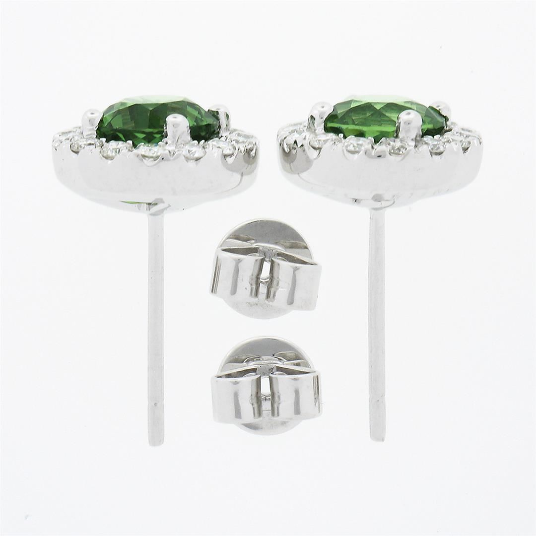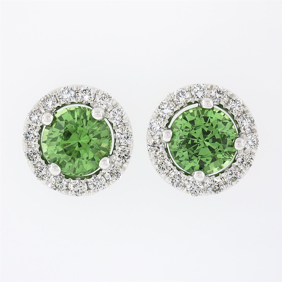 A new solid 14k white gold pair of stud earrings, with 2 round brilliant cut natural tsavorites (2.12ctw ), surrounded with a halo of 30 round brilliant cut natural diamonds (F/G - VS1/VS2 ; 0.43ctw). The earrings measure approximately 9.80mm in diameter and weigh a total of 3.26 grams.