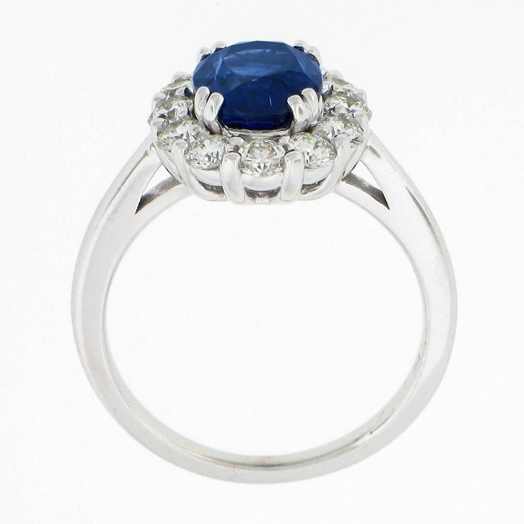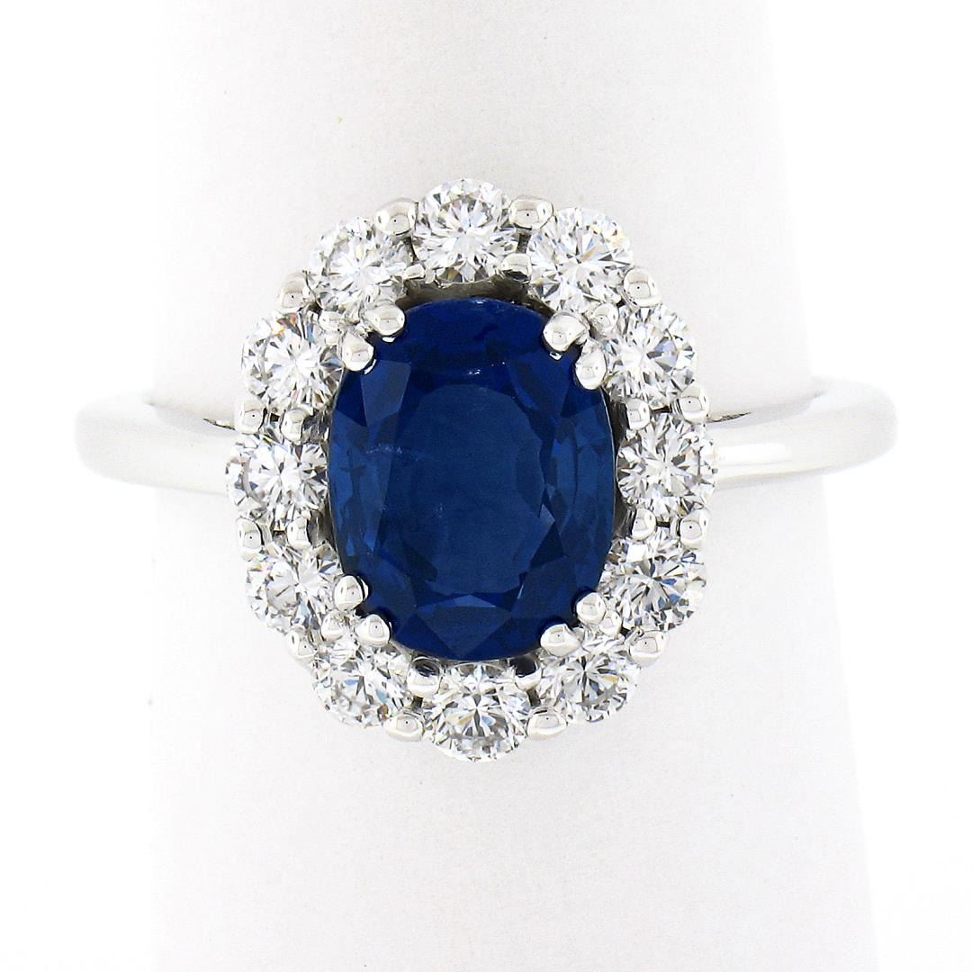 A new solid 18k white gold engagement ring, with 1 SSEF graded oval cut natrual sapphie (2.562ct), and a halo of 12 round brilliant cut natrual diamonds (F/G - VVS2/VS1 ; 0.83ctw). The ring is size 6.5, weighs a total of 5.10 grams, and measures 14.10mm wide. Comes with all original relevant certifications.