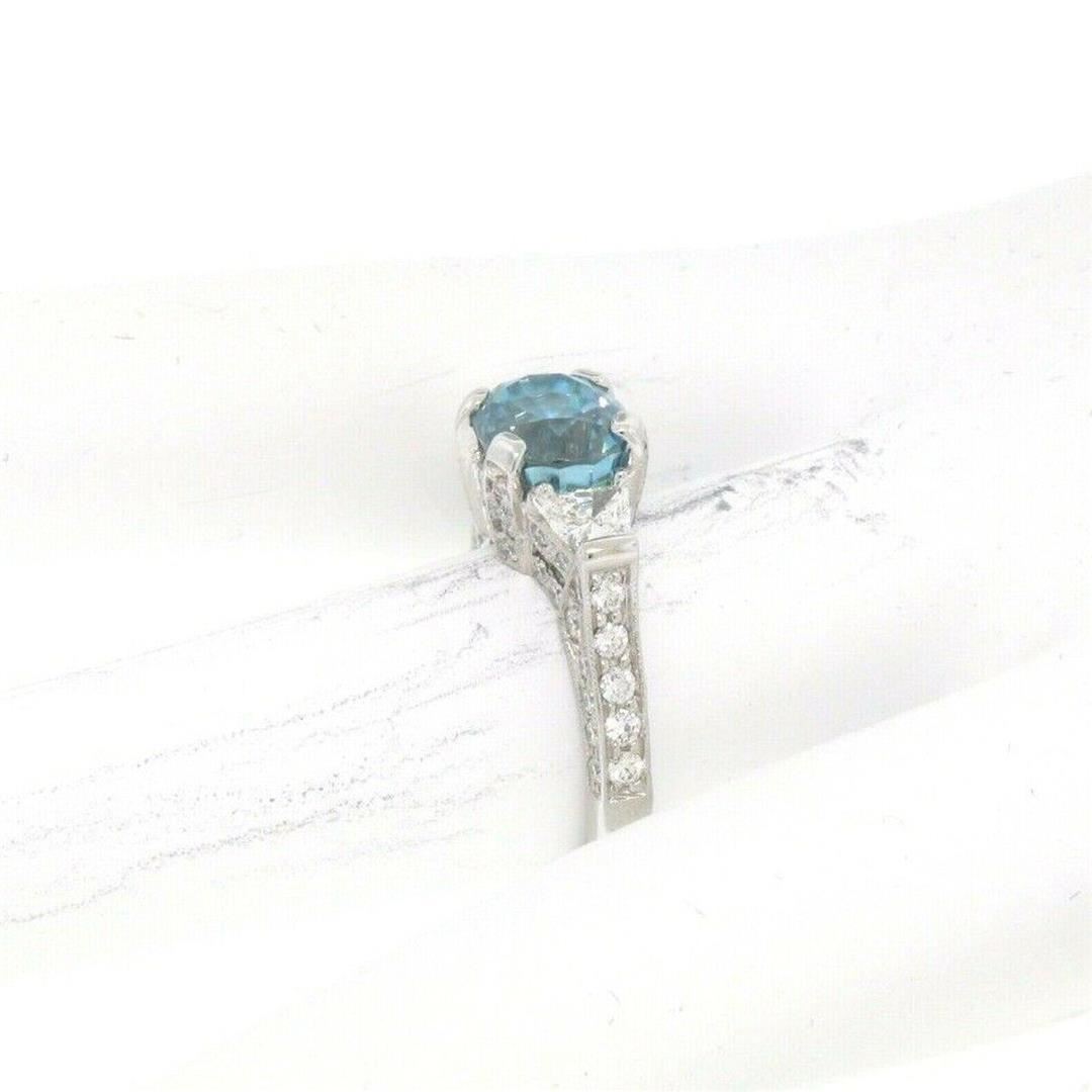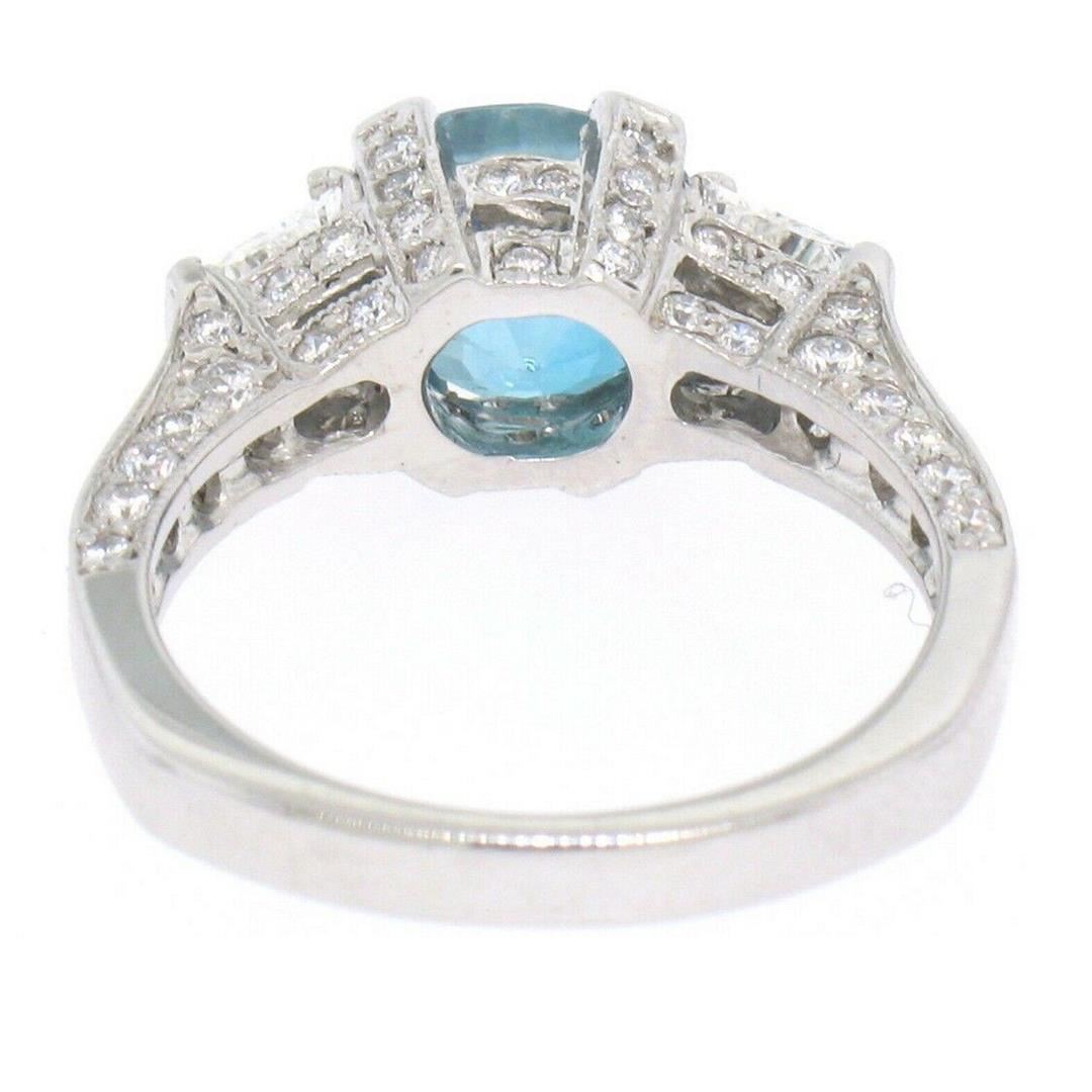 A new solid 18k white gold solitaire ring, featuring 1 oval brilliant cut natural blue zircon (8.0x6.60mm - 2.50ct), accented with 74 round brilliant cut natural diamonds (F/G-VS1/VS2; 0.59ctw ), and 2 trapezoidal cut natural diamonds (F/G- VS1/VS2; 0.82ctw). The ring is size 6.0, weighs a total of 5.20 grams, and measures 15.80mm wide.