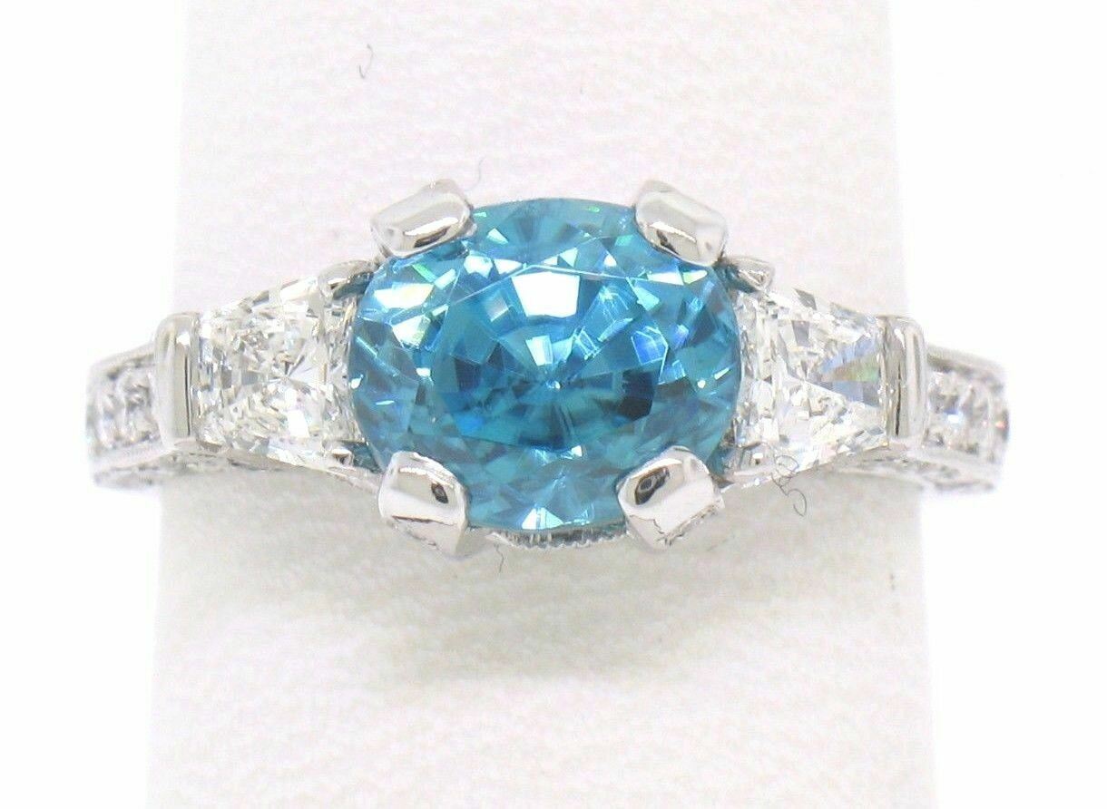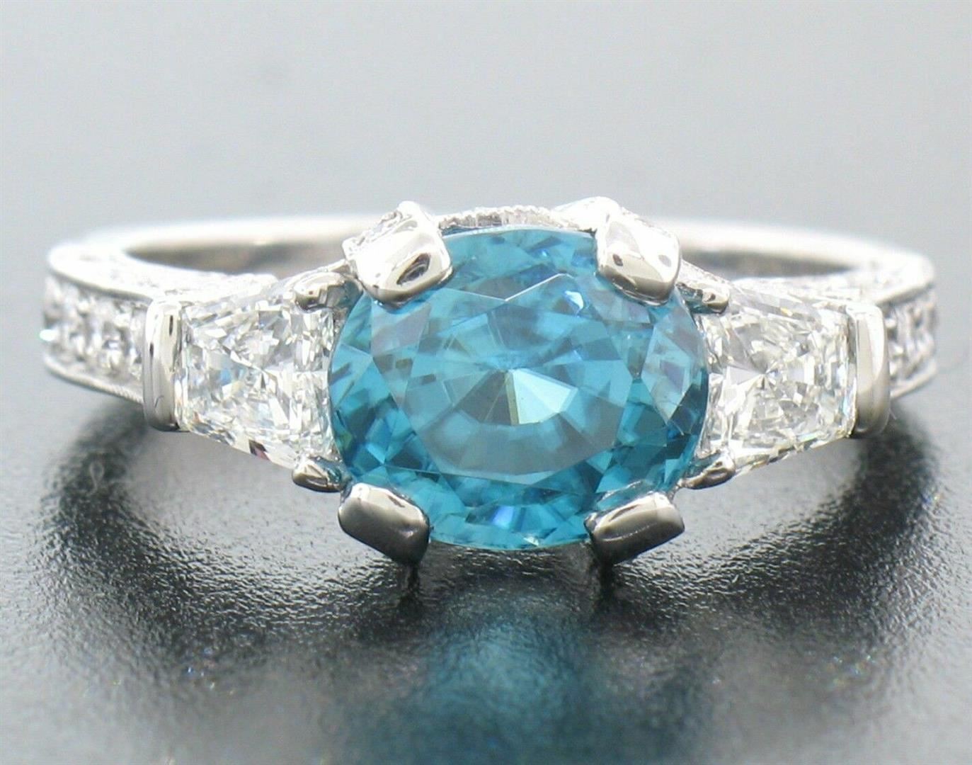 A new solid 18k white gold solitaire ring, featuring 1 oval brilliant cut natural blue zircon (8.0x6.60mm - 2.50ct), accented with 74 round brilliant cut natural diamonds (F/G-VS1/VS2; 0.59ctw ), and 2 trapezoidal cut natural diamonds (F/G- VS1/VS2; 0.82ctw). The ring is size 6.0, weighs a total of 5.20 grams, and measures 15.80mm wide.