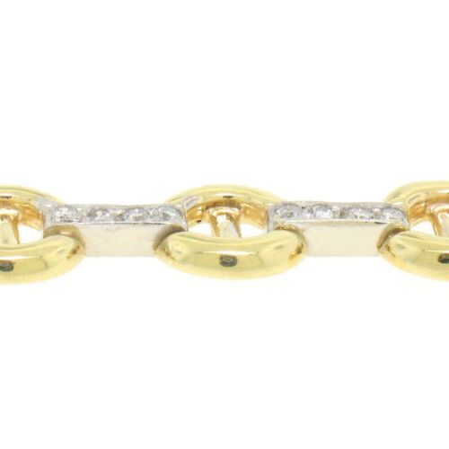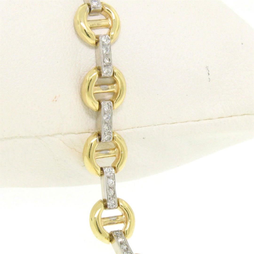 A new solid 14k yewllo and white gold bar link braceelt, featuring 56 round brilliant cut natural diamonds (G- VS2; 0.70ctw). It weighs a total of 12.3 grams, measures 8.94mm wide, and measures 7 inches in length.