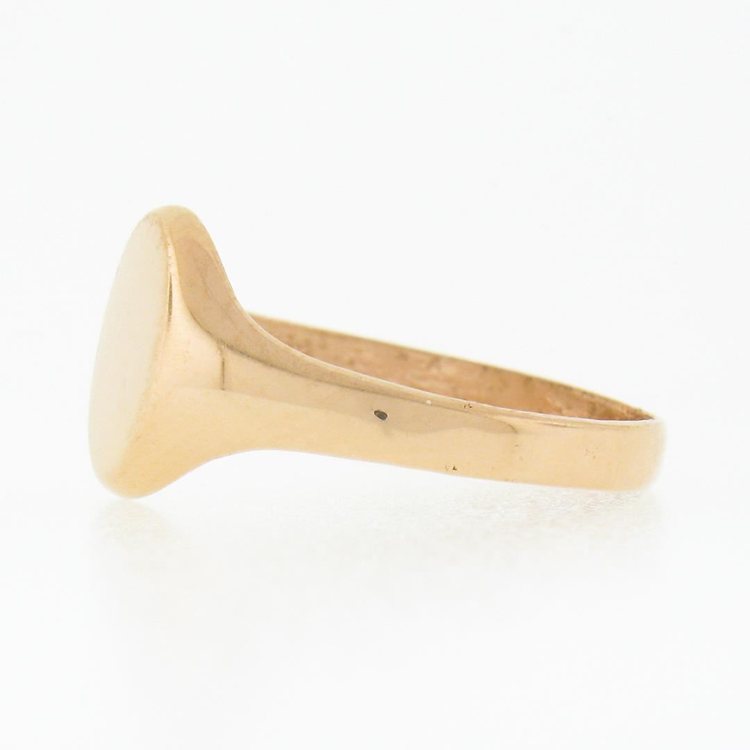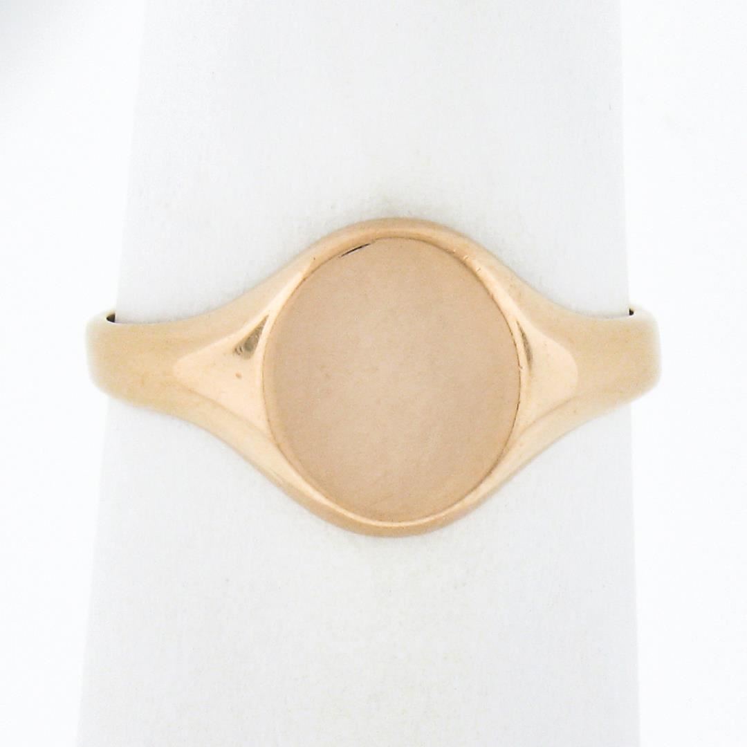 A news solid 14k rose gold engraveable signet ring. The ring is size 4.0, weighs a total of 1.51 grams, and measures 9.0mm wide.