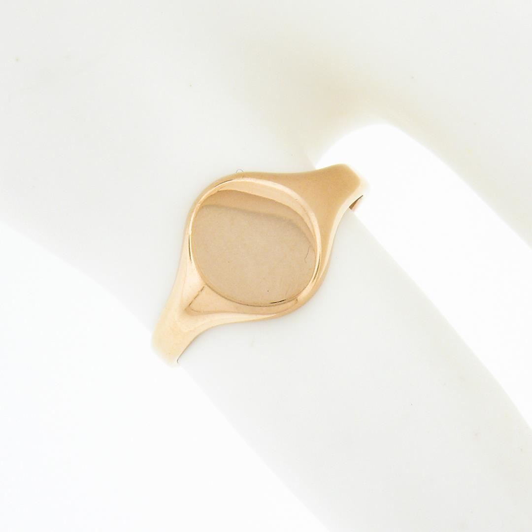 A news solid 14k rose gold engraveable signet ring. The ring is size 4.0, weighs a total of 1.51 grams, and measures 9.0mm wide.