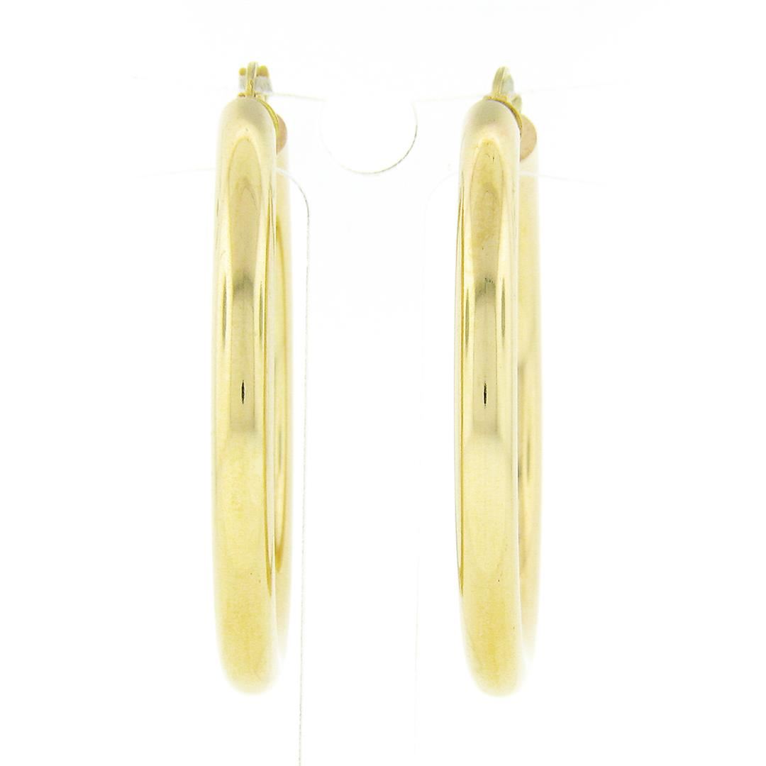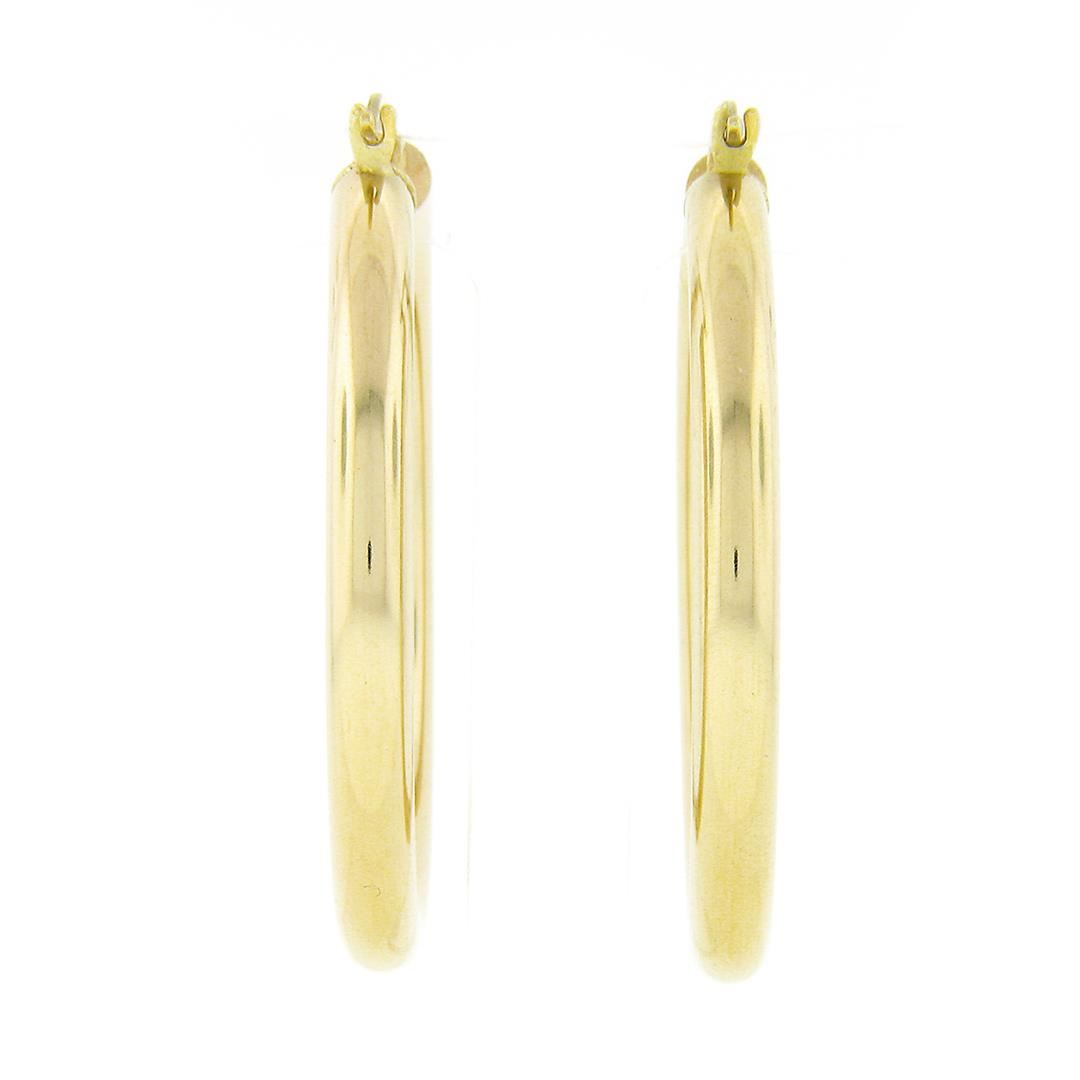 A new solid 14k yellow gold pair of hoop earrings. The earrings measure approximately 39.85mm in diameter and weigh a total of 4.85 grams.