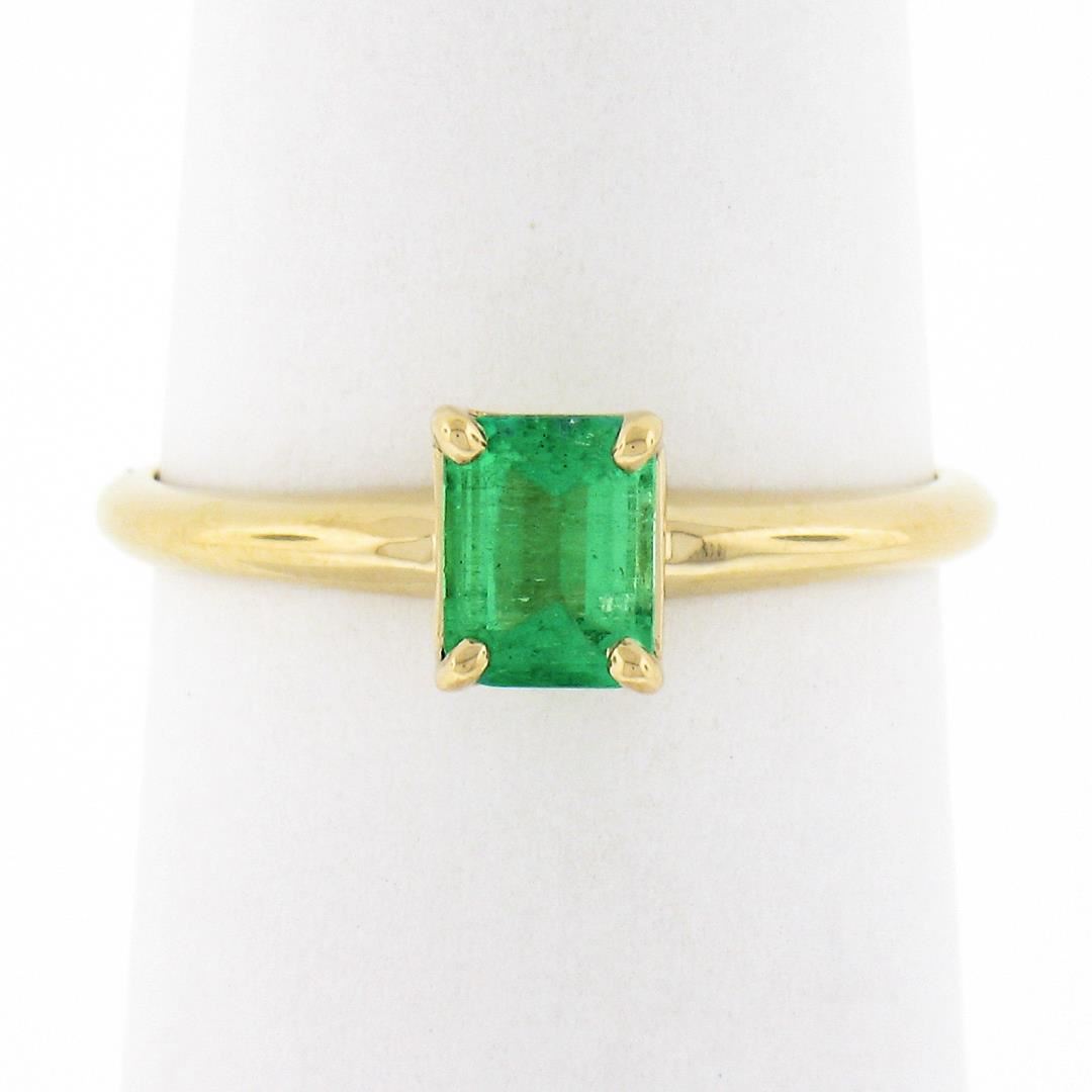 A new solid 14k yellow gold ring, with 1 emerald cut natural emerald (0.51ct). The ring is size 5.5, weighs a total of 1.74 grams, and measures 5.9mm wide.