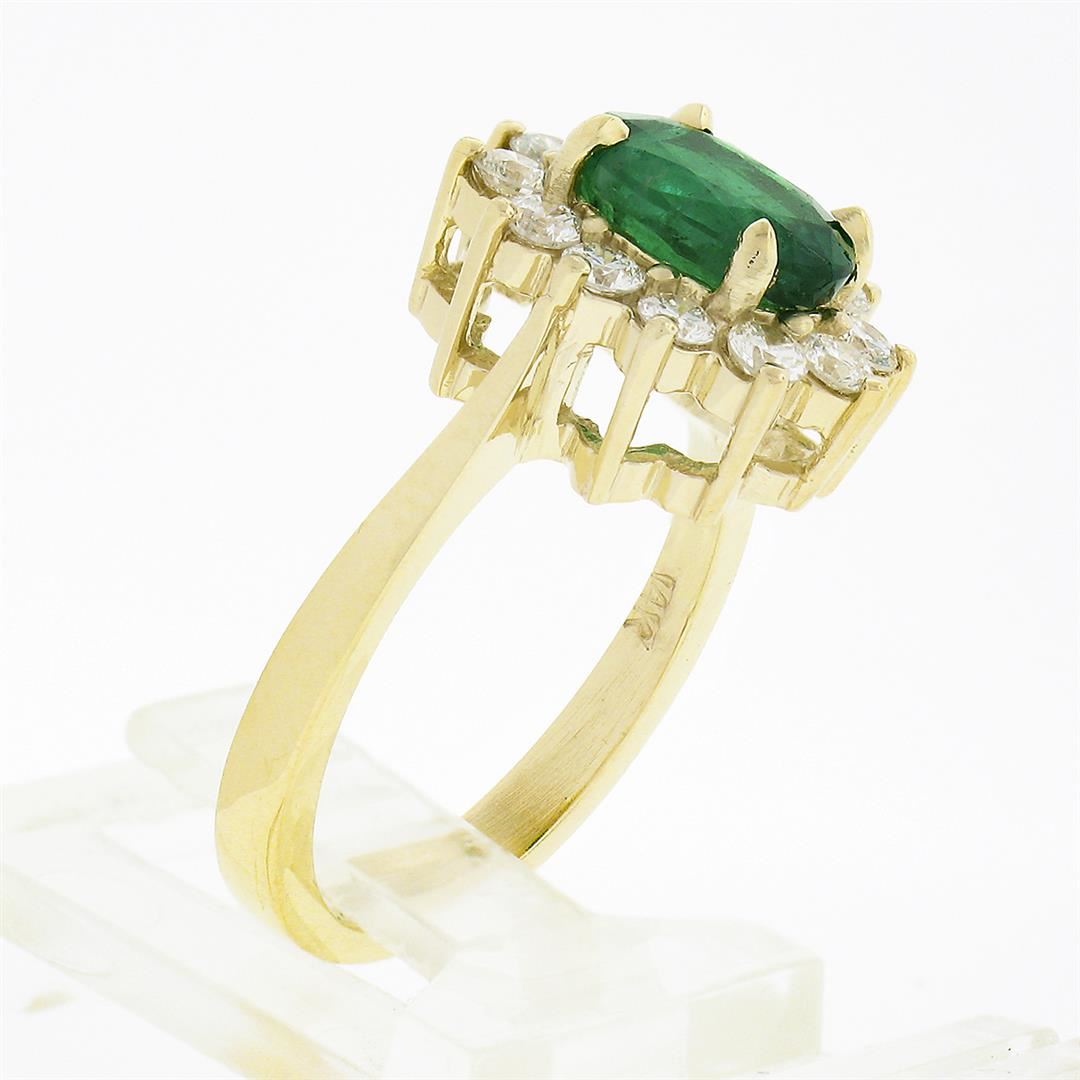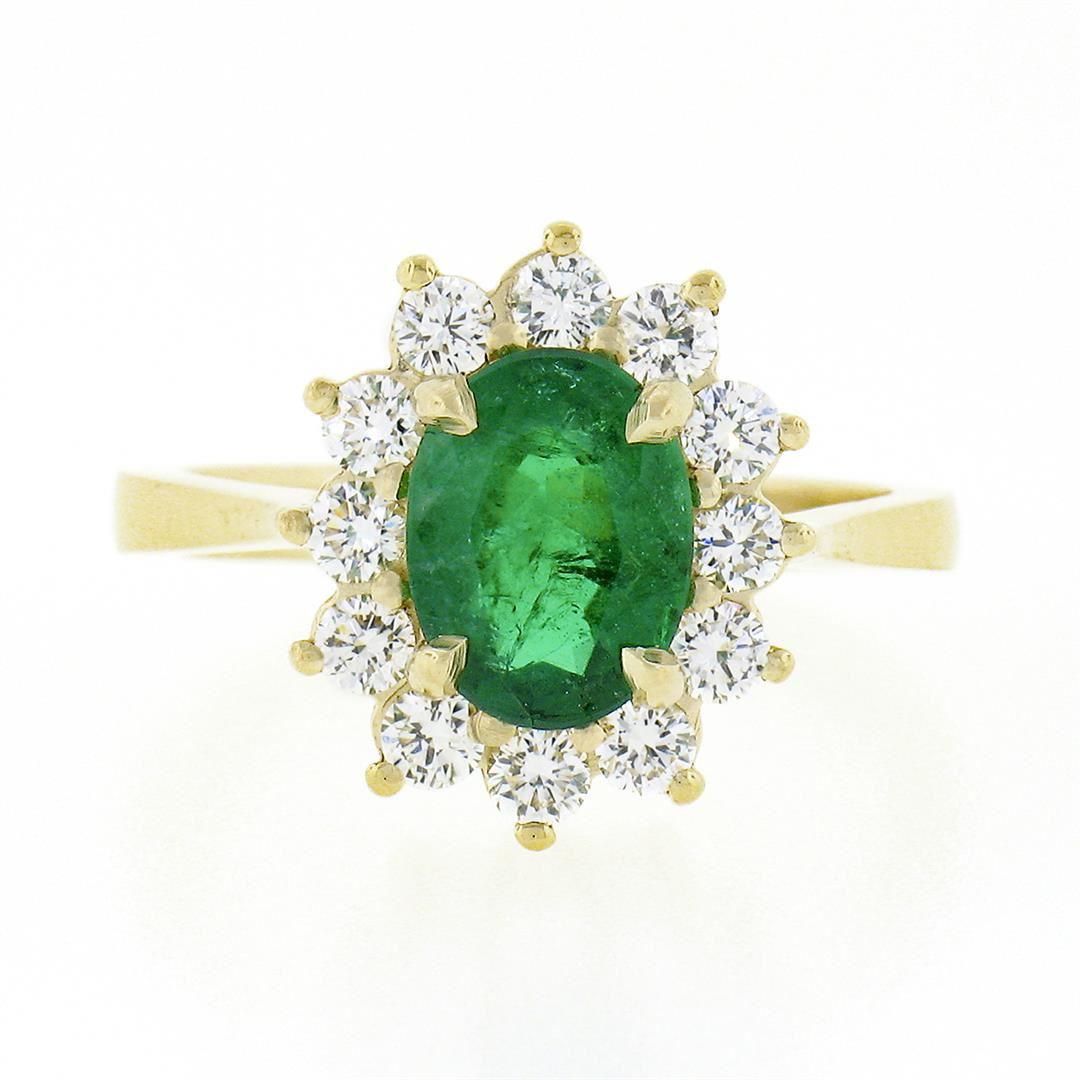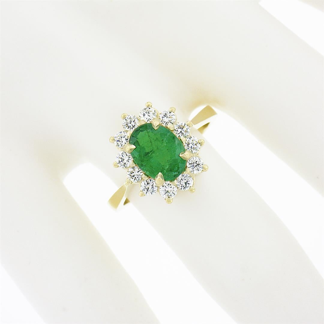 A new solid 14k yellow gold ring, with 1 oval cut natural emerald (1.45ct), surrounded with a halo of 12 round brilliant cut natural diamonds (G/H - VS1/VS2 ; 0.57ctw). The ring is size 6.0, weighs a total of 4.77 grams, and measures 14.10mm wide.