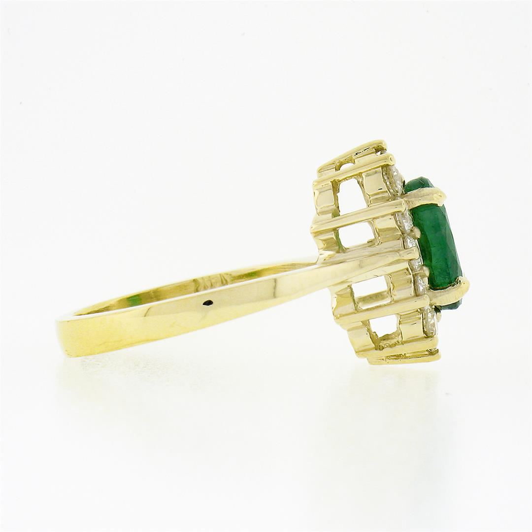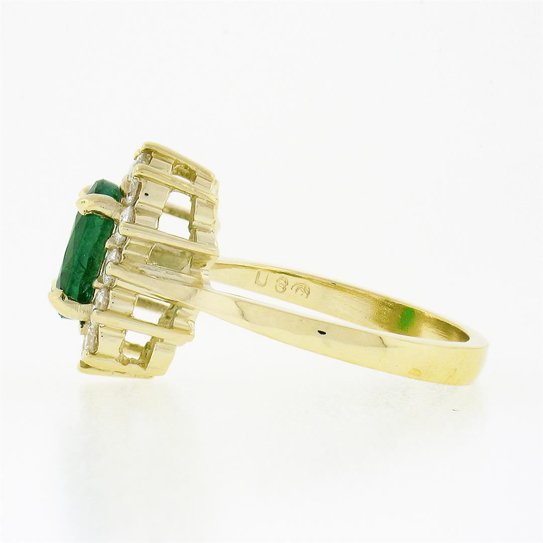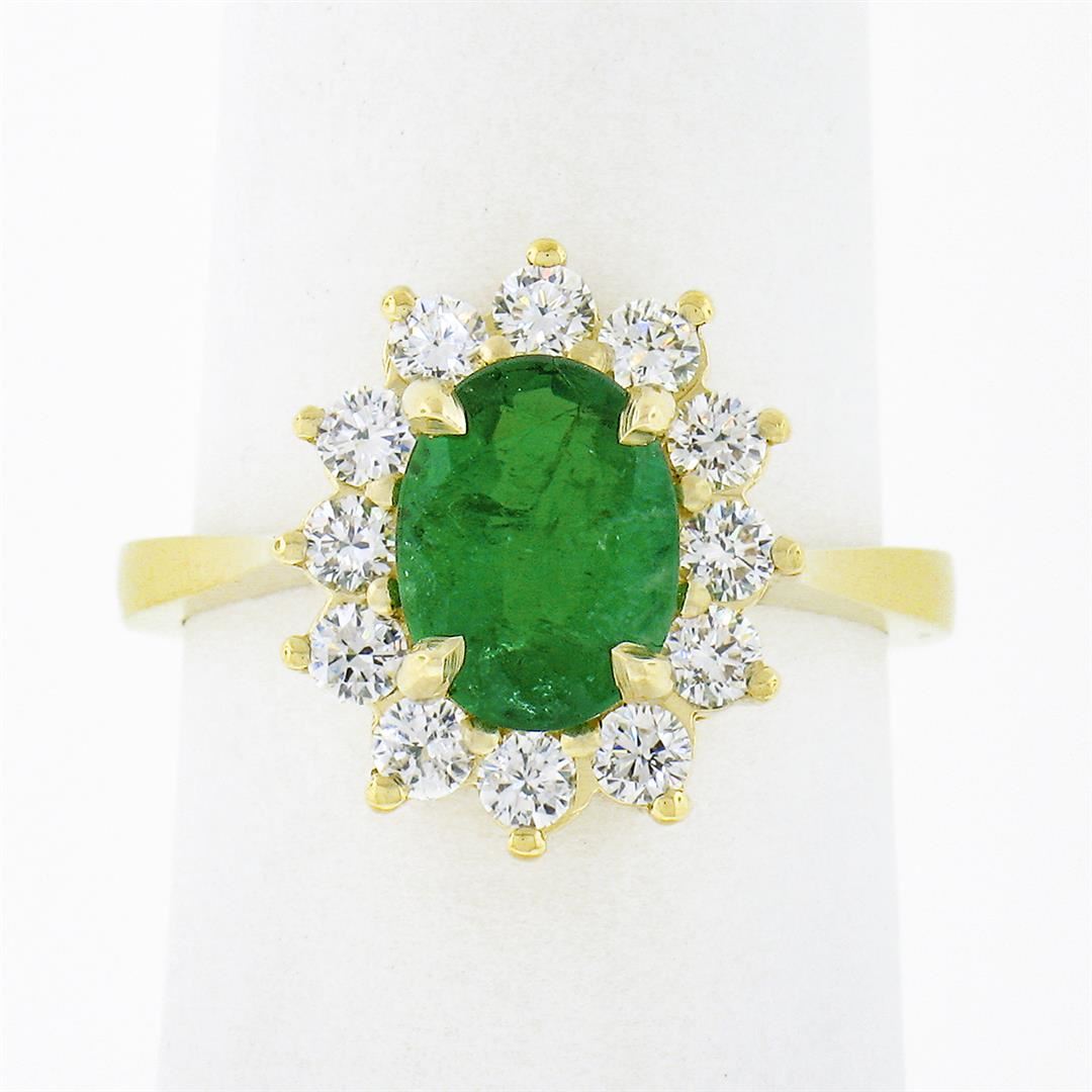 A new solid 14k yellow gold ring, with 1 oval cut natural emerald (1.45ct), surrounded with a halo of 12 round brilliant cut natural diamonds (G/H - VS1/VS2 ; 0.57ctw). The ring is size 6.0, weighs a total of 4.77 grams, and measures 14.10mm wide.
