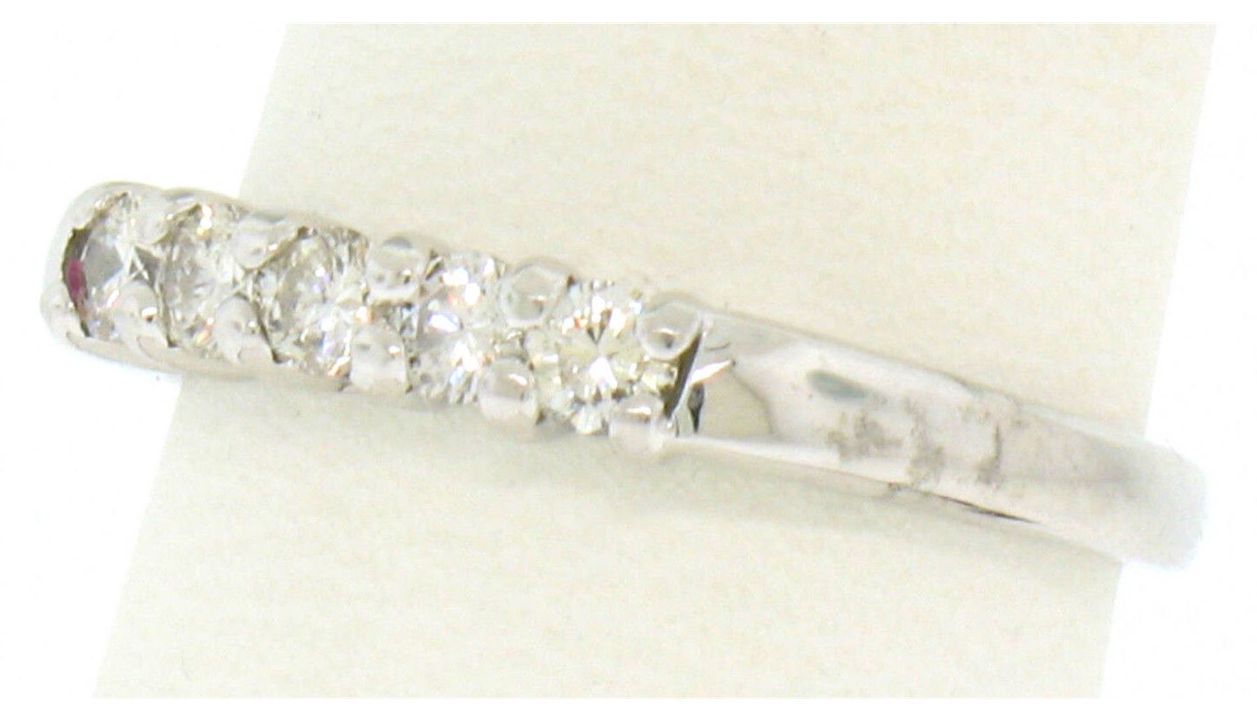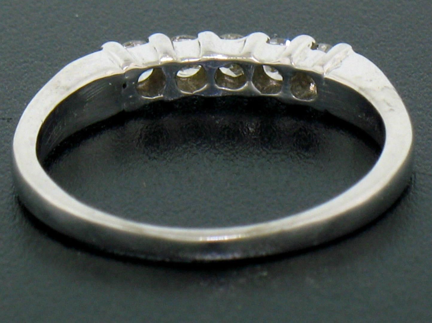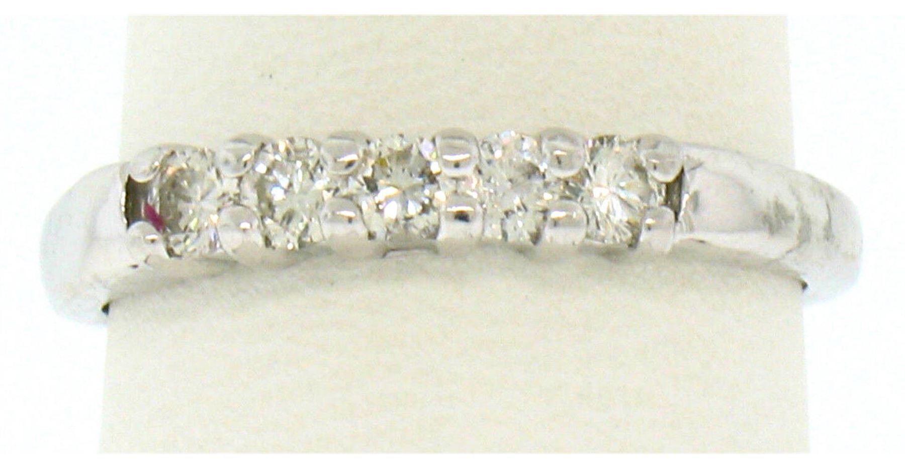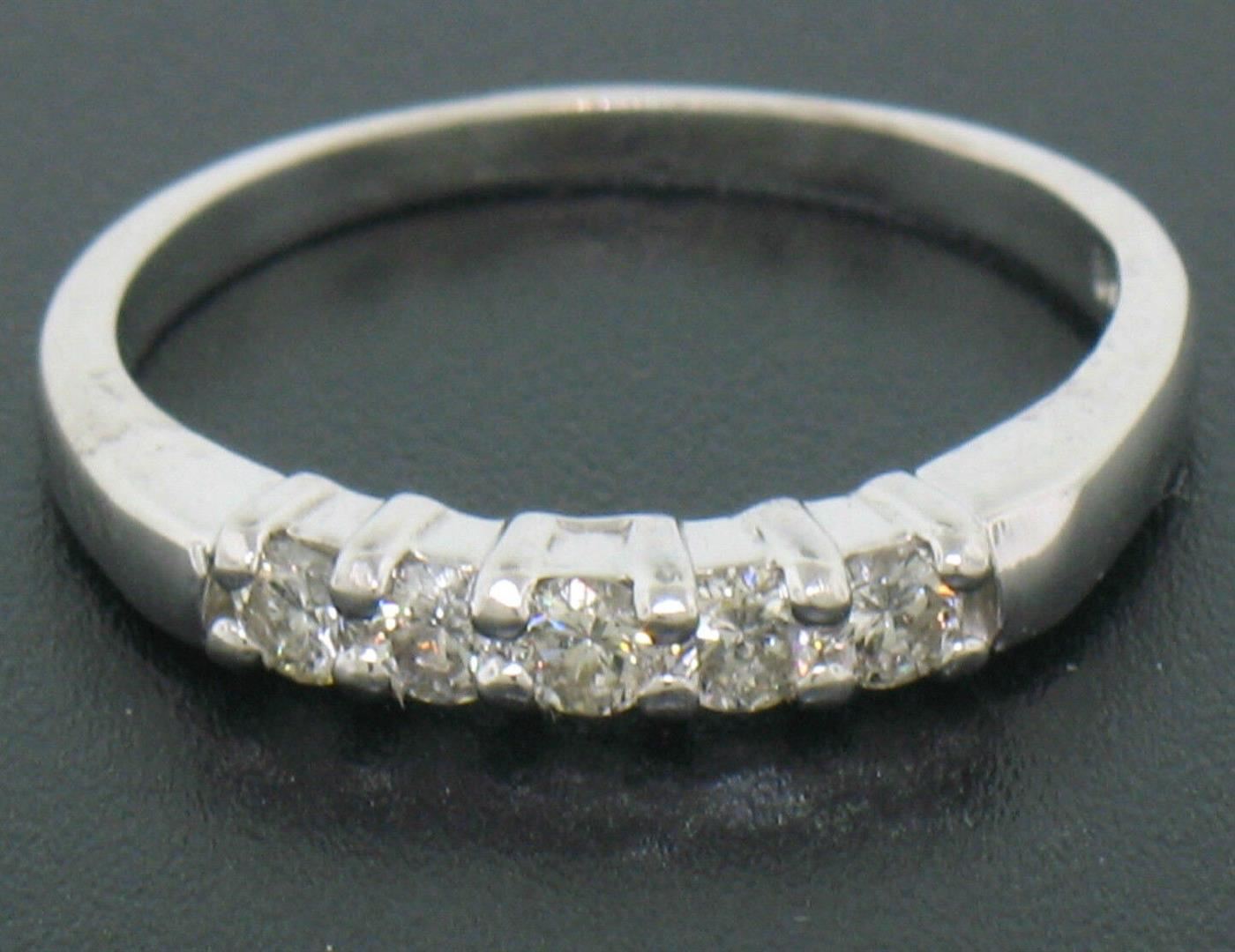 A new solid 14k white gold banr ring, with 5 round brilliant cut natural diamonds (H/I- VS2; 0.35ctw). The ring is size 6.0, weighs a total of 2.3 grams, and measures 3.11mm wide.