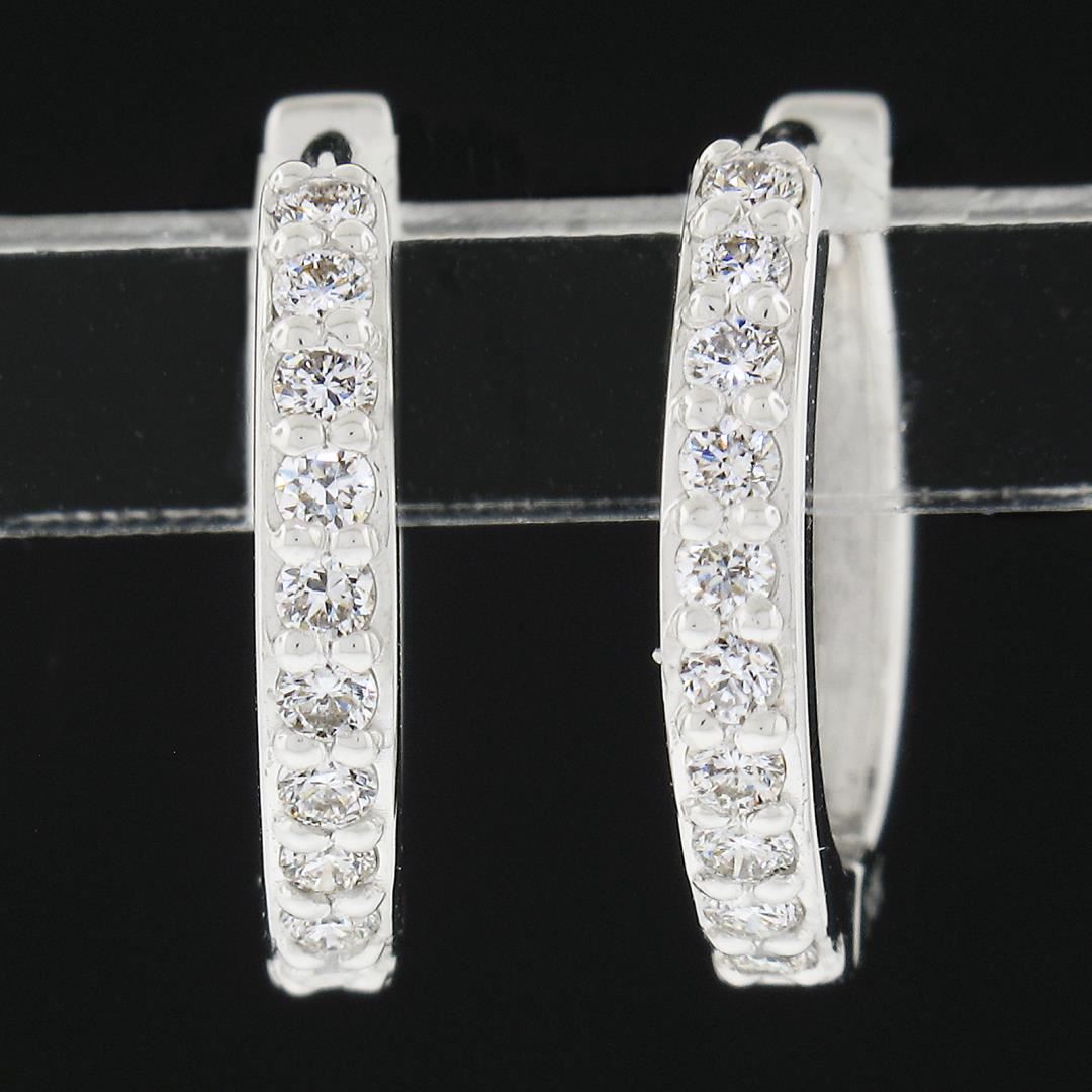 A new solid 14k white gold hoop earrings, with 20 round brilliant cut natural diamonds (G/H - VS1/VS2 ; 0.20ctw). The earrings measure approximately 12.2x2.1mm and weigh a total of 1.71 grams.