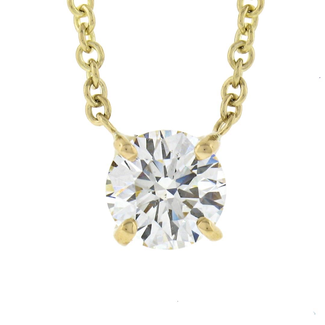 A new solid 14k yellow gold pendant necklace, with 1 round brilliant cut natural diamond (I- VS2 ; 0.58ct). Adjustabel 16 & 18 inch cable link chain, 2.59 grams total weight, pendant diameter measures 5.4mm.