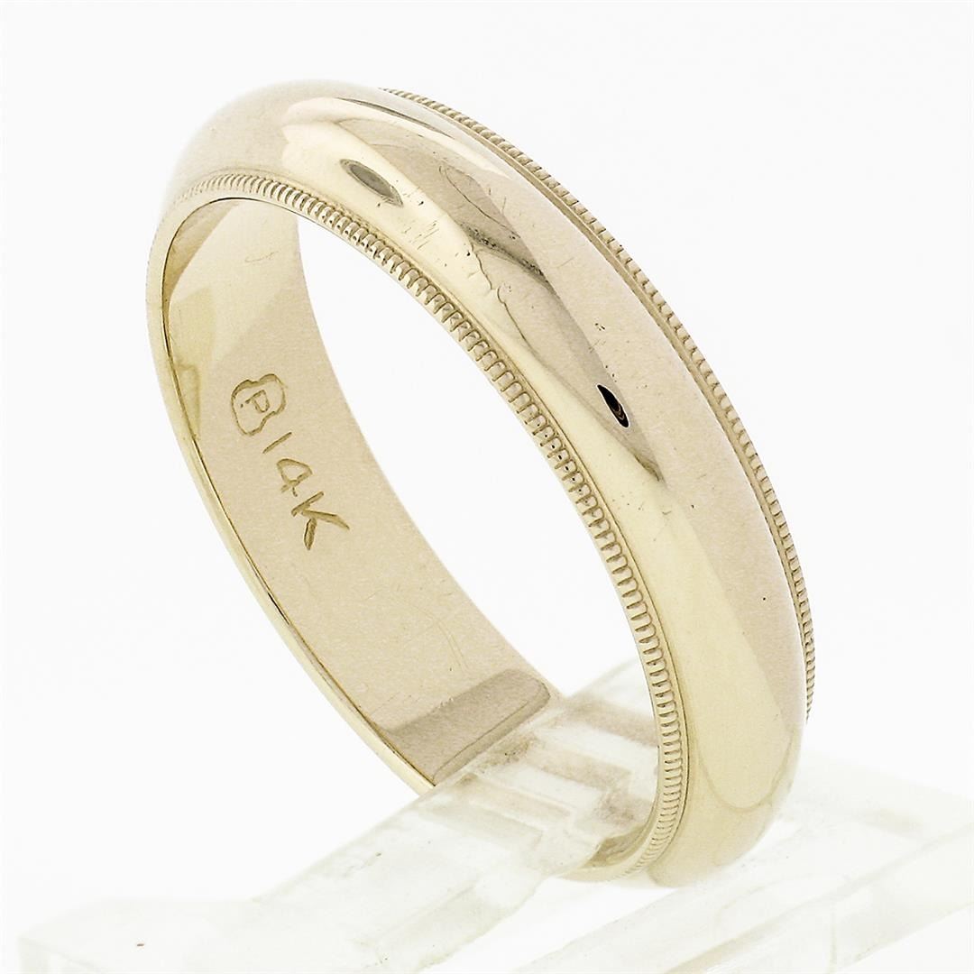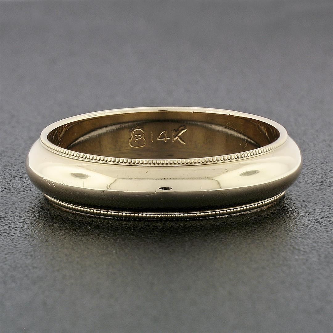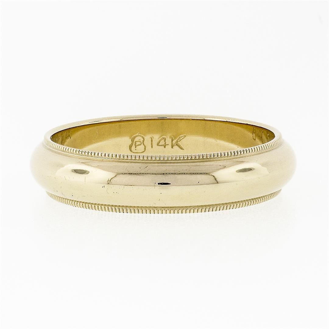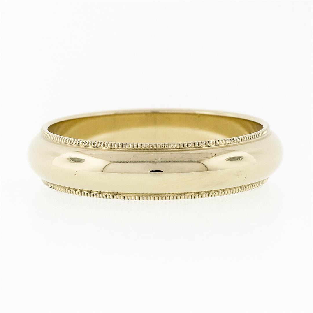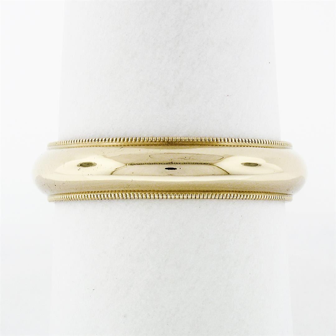 A new solid 14k yellow gold milgrain plain band ring. The ring is size 9.5, weighs a total of 5.79 grams, and measures 5.02mm wide.