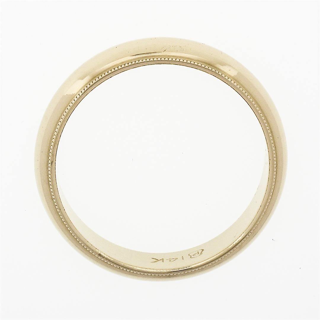 A new solid 14k yellow gold milgrain plain band ring. The ring is size 9.5, weighs a total of 5.79 grams, and measures 5.02mm wide.