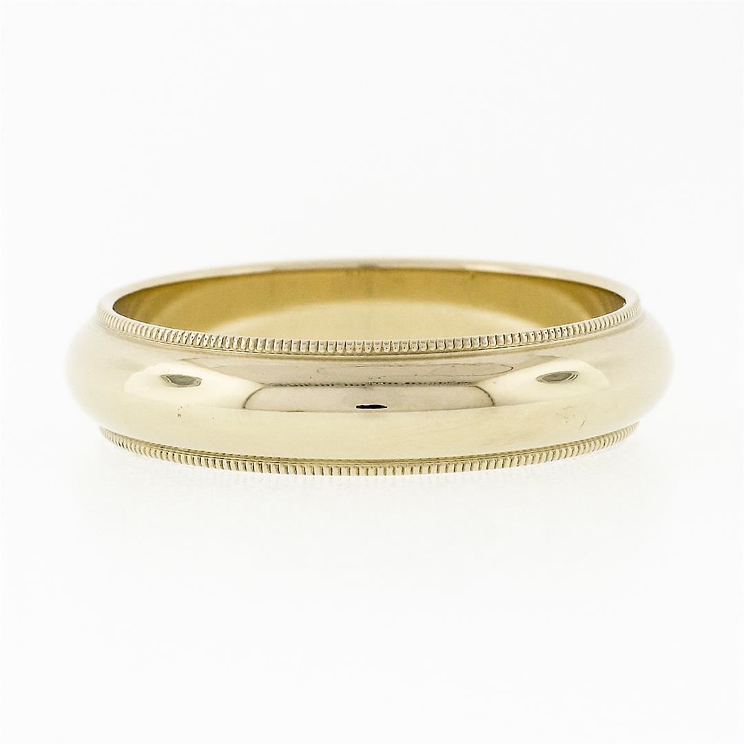 A new solid 14k yellow gold milgrain plain band ring. The ring is size 9.5, weighs a total of 5.79 grams, and measures 5.02mm wide.