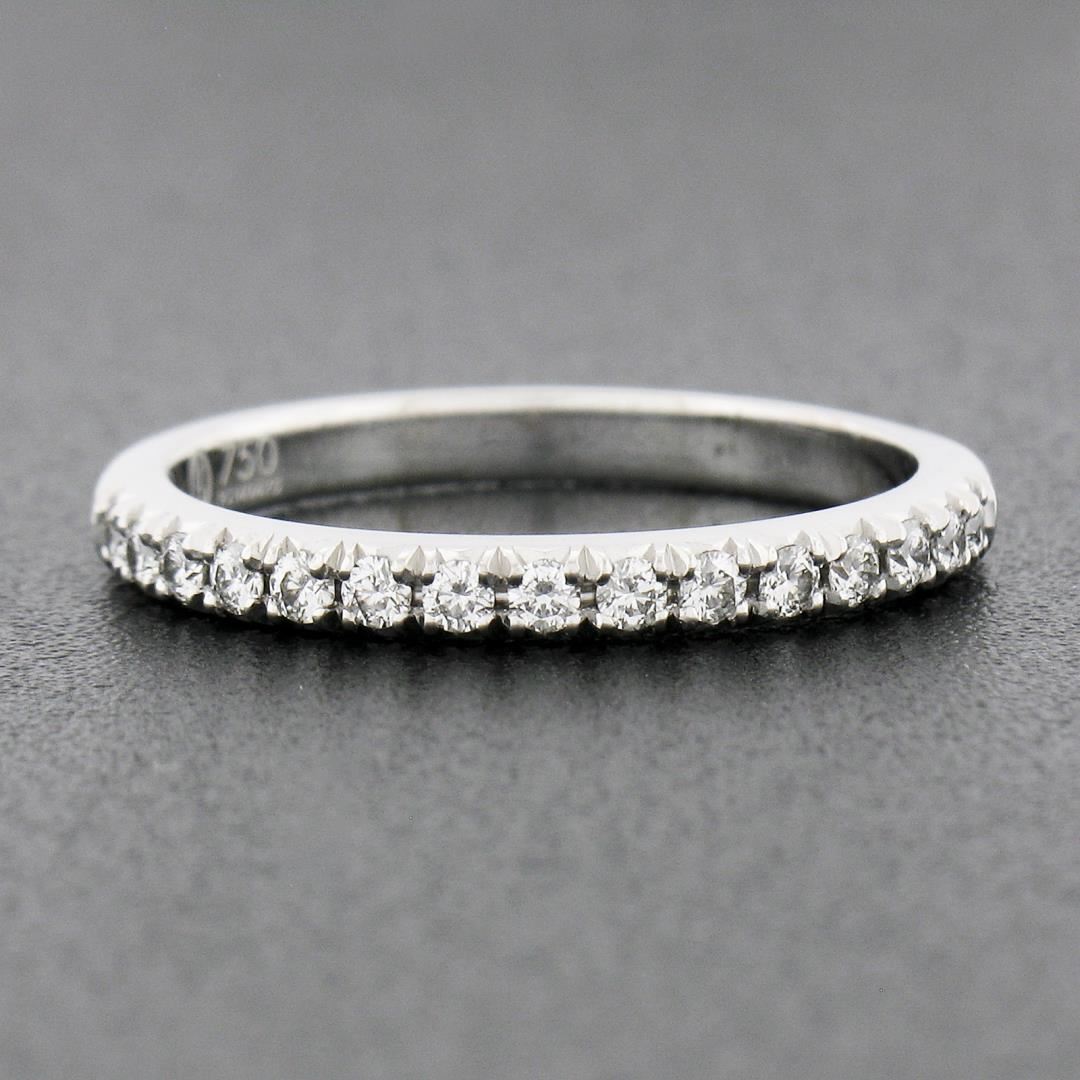 A new solid 18k white gold band ring, with 15 round brilliant cut natural diamonds (F/G - VS1/VS2 ; 0.25ctw). The ring is size 6.0, weighs a total of 2.66 grams, and measures 2.2mm wide.