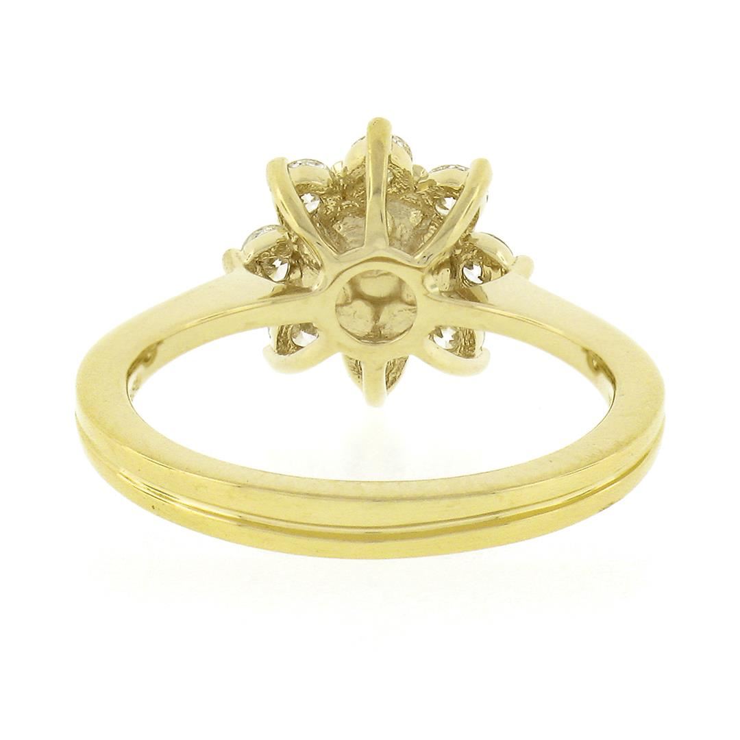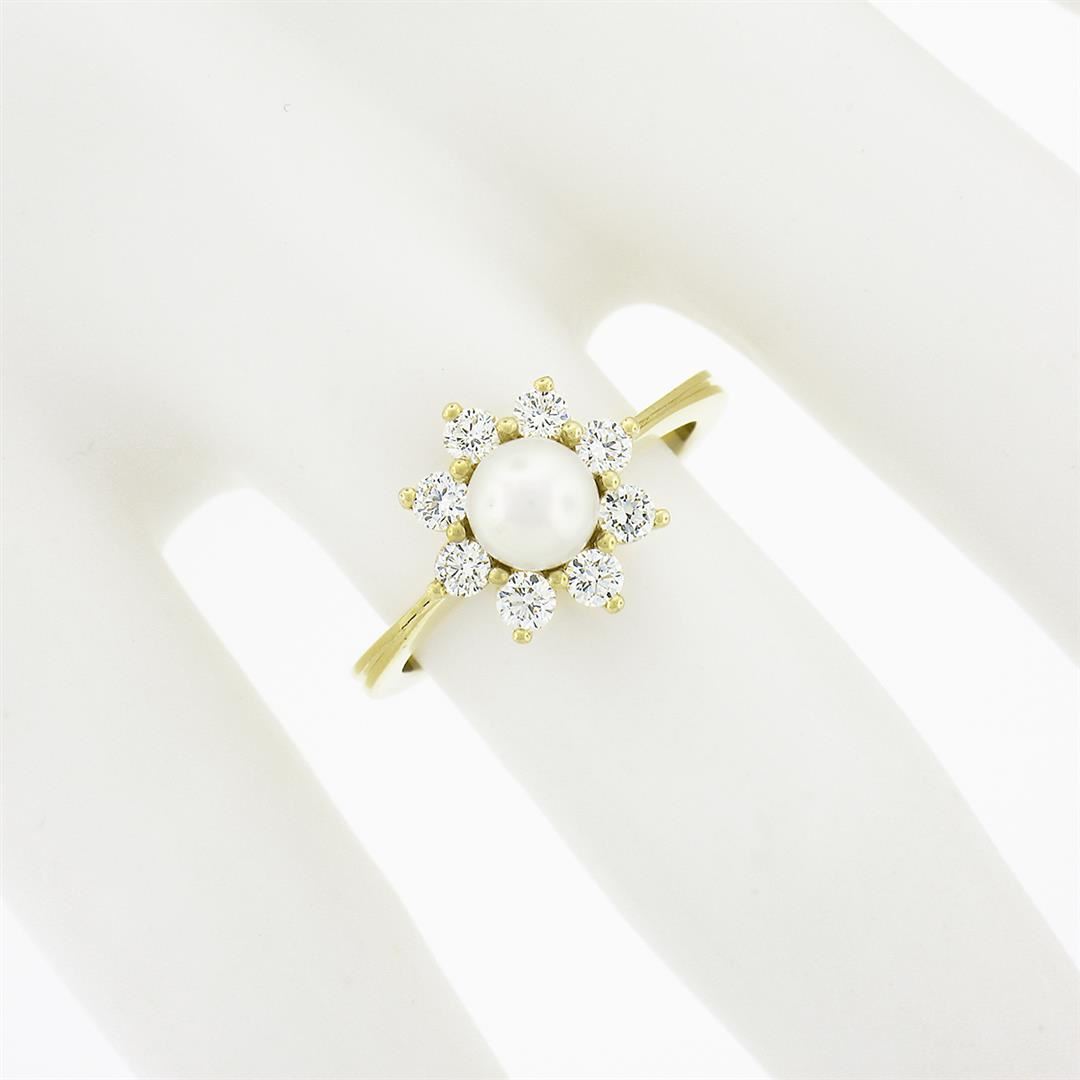A new solod 18k yellow gold ring, with 1 round shape cultured pearl (5.25mm), surrounded with 8 round brilliant cut natural diamonds (G/H - VS1/VS2 ; 0.40ctw). The ring is size 5.0, weighs a total of 3.7 grams, and measures 10.60mm wide.