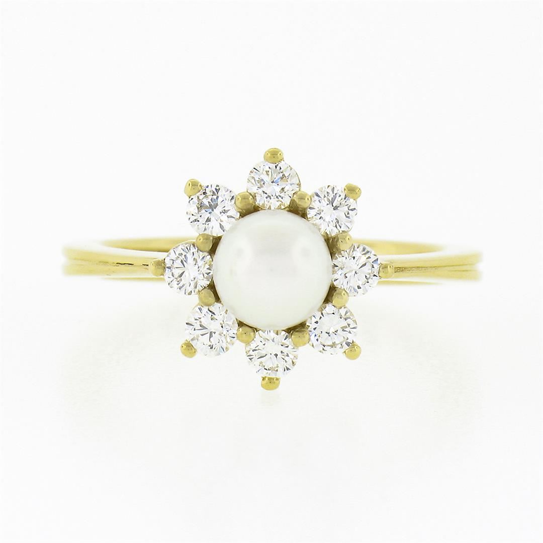A new solod 18k yellow gold ring, with 1 round shape cultured pearl (5.25mm), surrounded with 8 round brilliant cut natural diamonds (G/H - VS1/VS2 ; 0.40ctw). The ring is size 5.0, weighs a total of 3.7 grams, and measures 10.60mm wide.