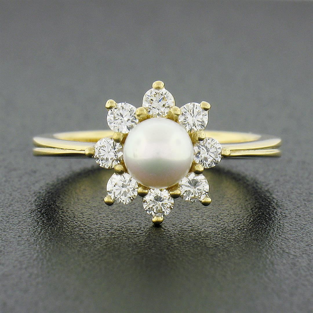 A new solod 18k yellow gold ring, with 1 round shape cultured pearl (5.25mm), surrounded with 8 round brilliant cut natural diamonds (G/H - VS1/VS2 ; 0.40ctw). The ring is size 5.0, weighs a total of 3.7 grams, and measures 10.60mm wide.
