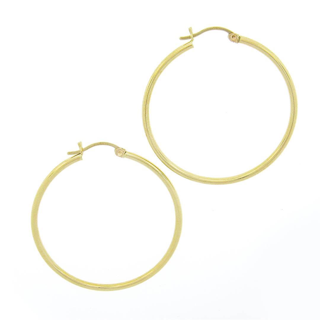 A new solid 14k yellow gold large hoop earrings. The earrings measure approximately 39.60mm in diameter and weigh a total of 2.68 grams.