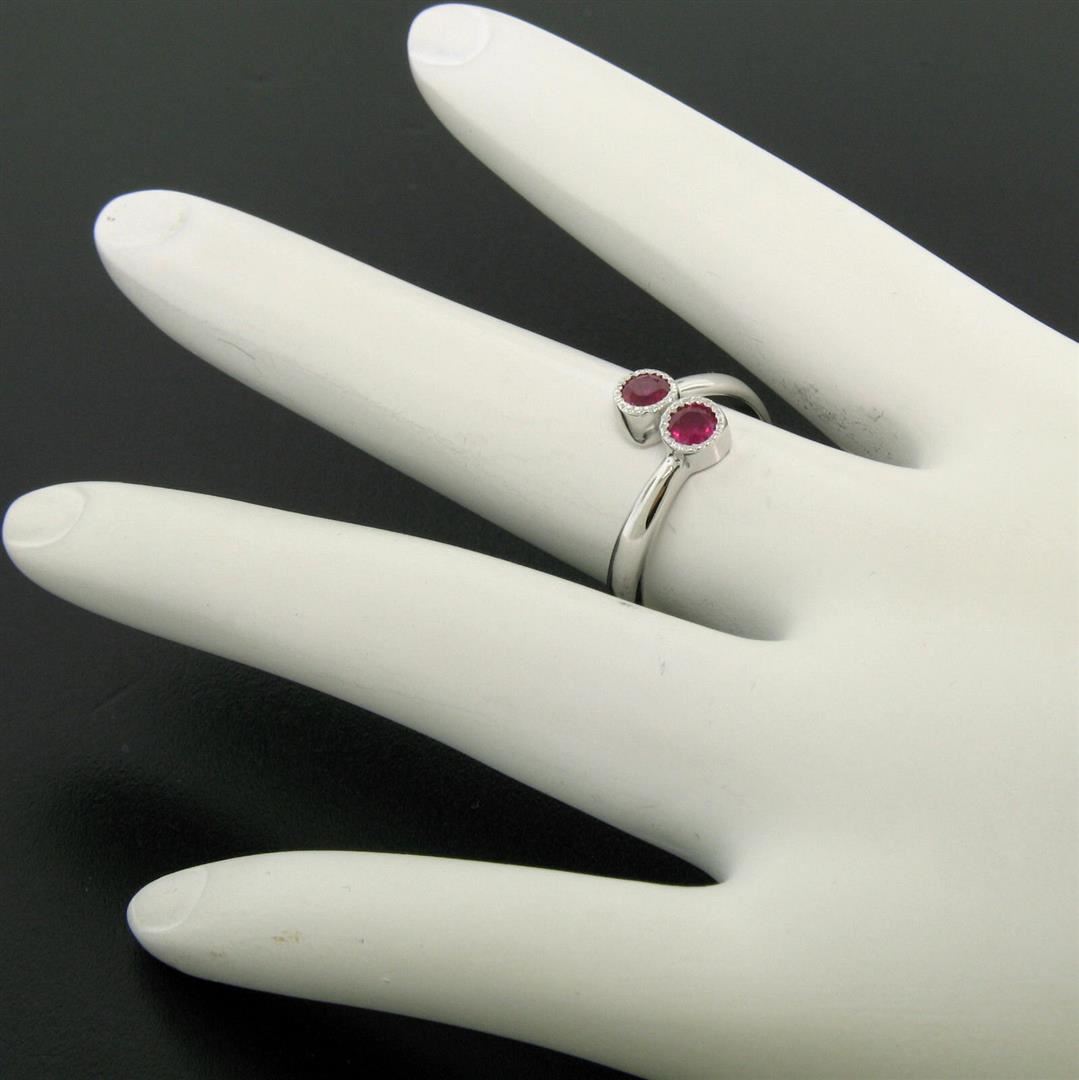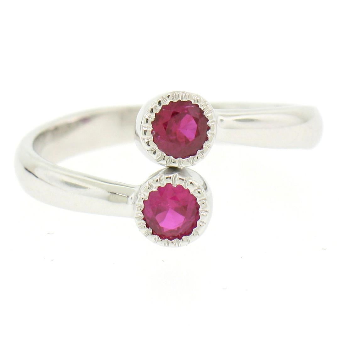 A new solid 14k white gold bypass ring, featuring 2 round cut natural rubies (0.44ctw). The ring is size 6.0, weighs a total of 2.6 grams, and measures 9.17mm wide.