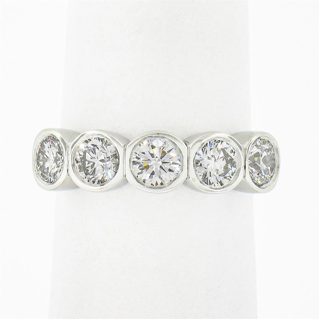 A new solid platinum band ring, with 5 round brilliant cut natural diamonds ( F/G - VS1/VS2 ; 1.19ctw). The ring is size 5.5, weighs a total of 8.13 grams, and measures 5.15mm wide.